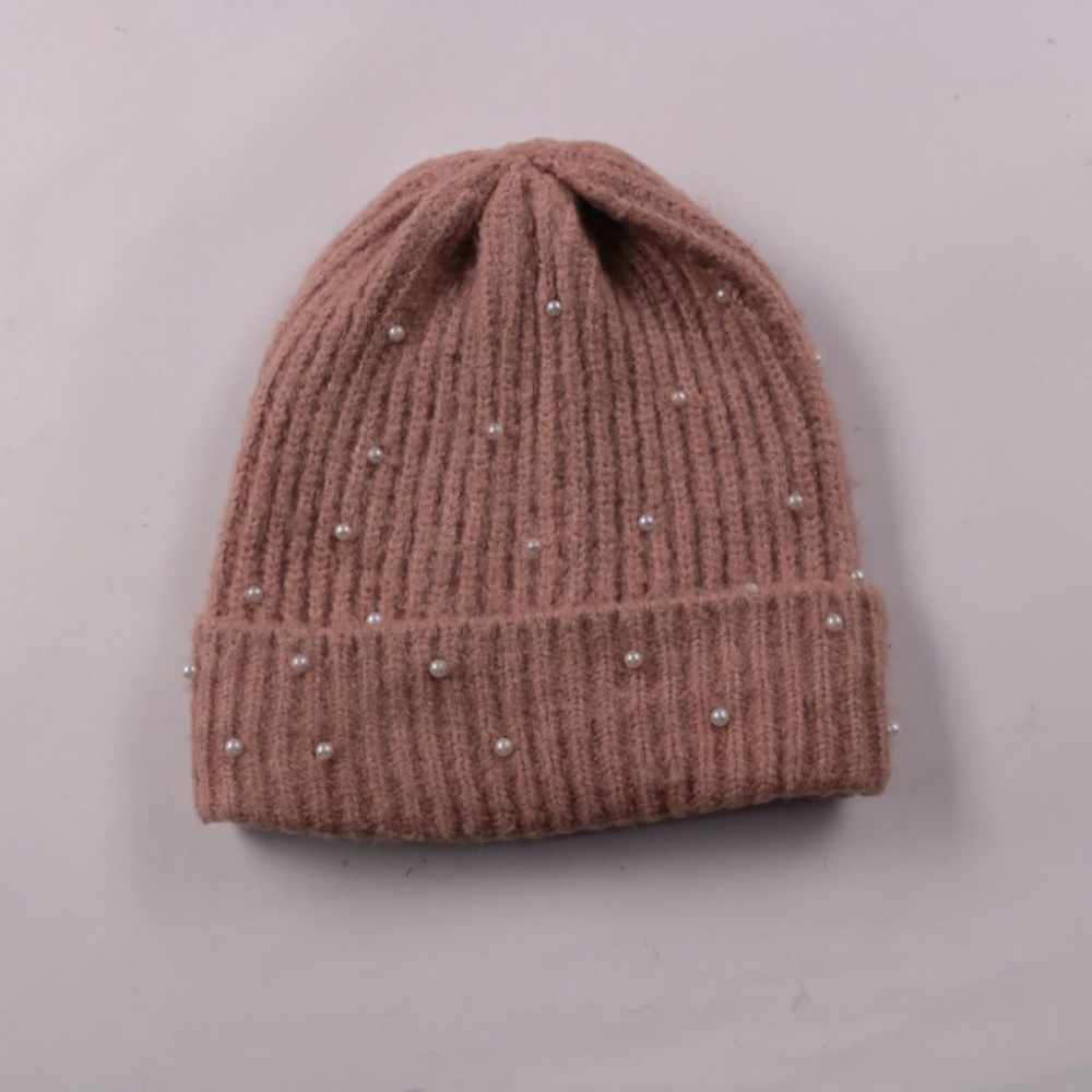 Вязаная шапка бини без бренда, пудрово-розового цвета, украшена мелкими бусинами. Подойдёт для зимних прогулок и повседневных образов, хорошо сочетается с пальто или пуховиком. Акриловая пряжа проста в уходе и быстро сохнет.