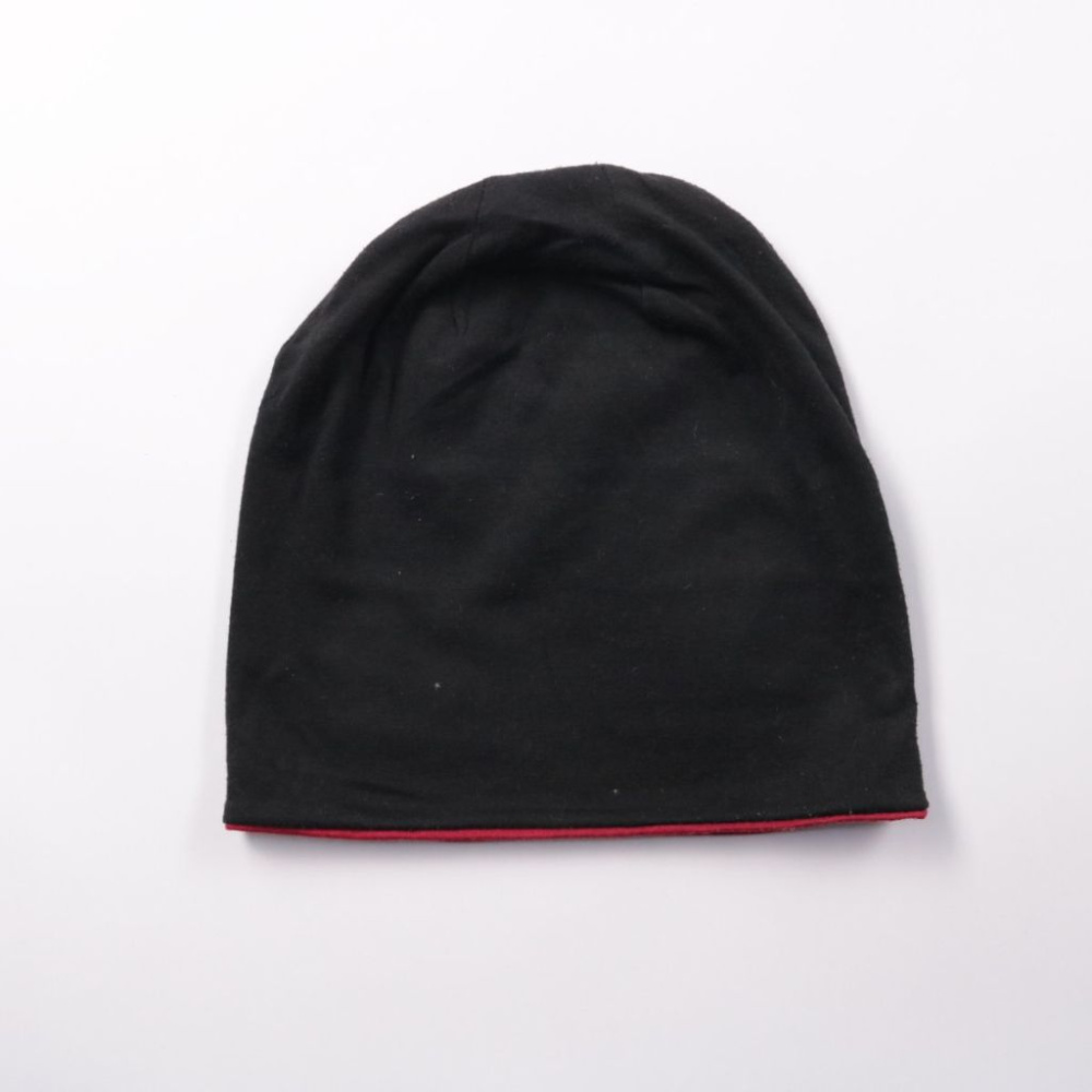 Тонкая двусторонняя шапка-бини без бренда: с одной стороны чёрная, с другой — бордовая. Подойдёт на каждый день для прогулок и спорта в прохладную погоду. Легко сочетать с разной верхней одеждой и можно носить на обе стороны.