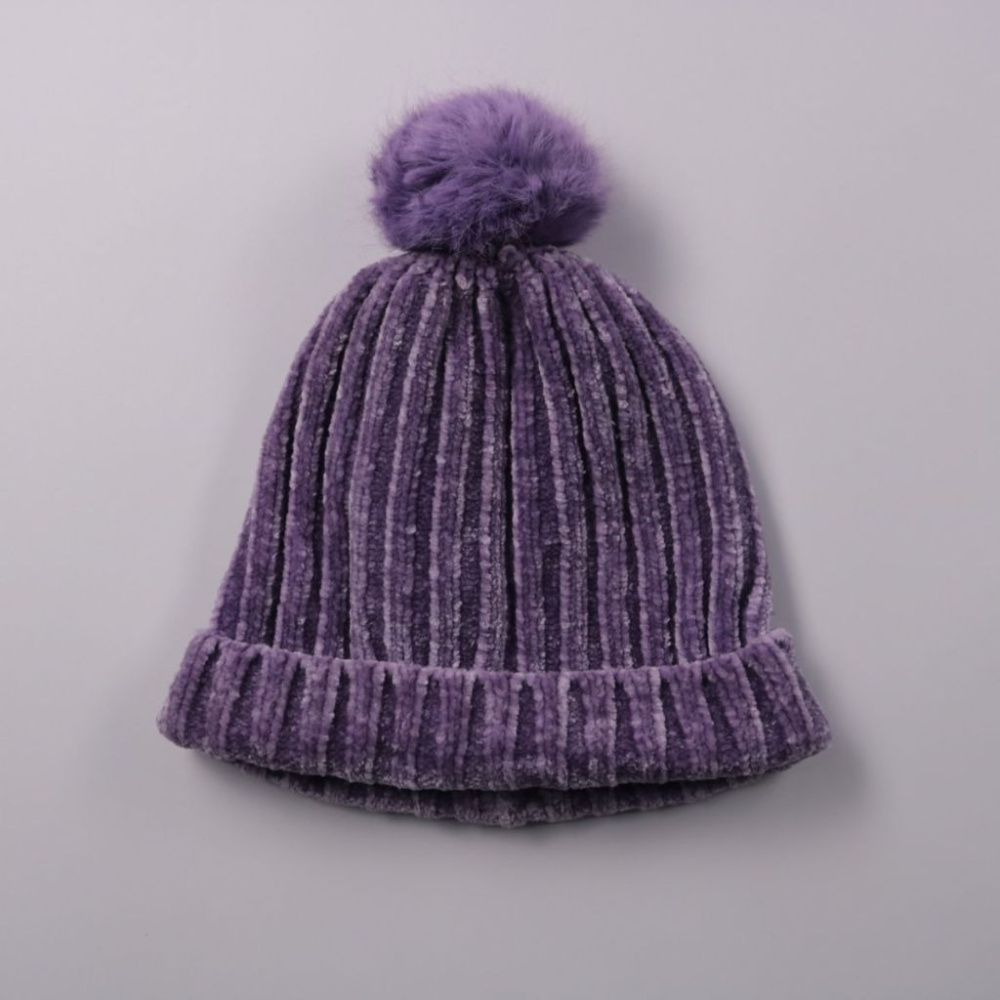 Шапка H&M фиолетового цвета в рубчик с помпоном, хорошо закрывает уши и подходит для зимних прогулок. Мягкий материал комфортно сидит и тянется. Практичный вариант — легко стирается и быстро сохнет.