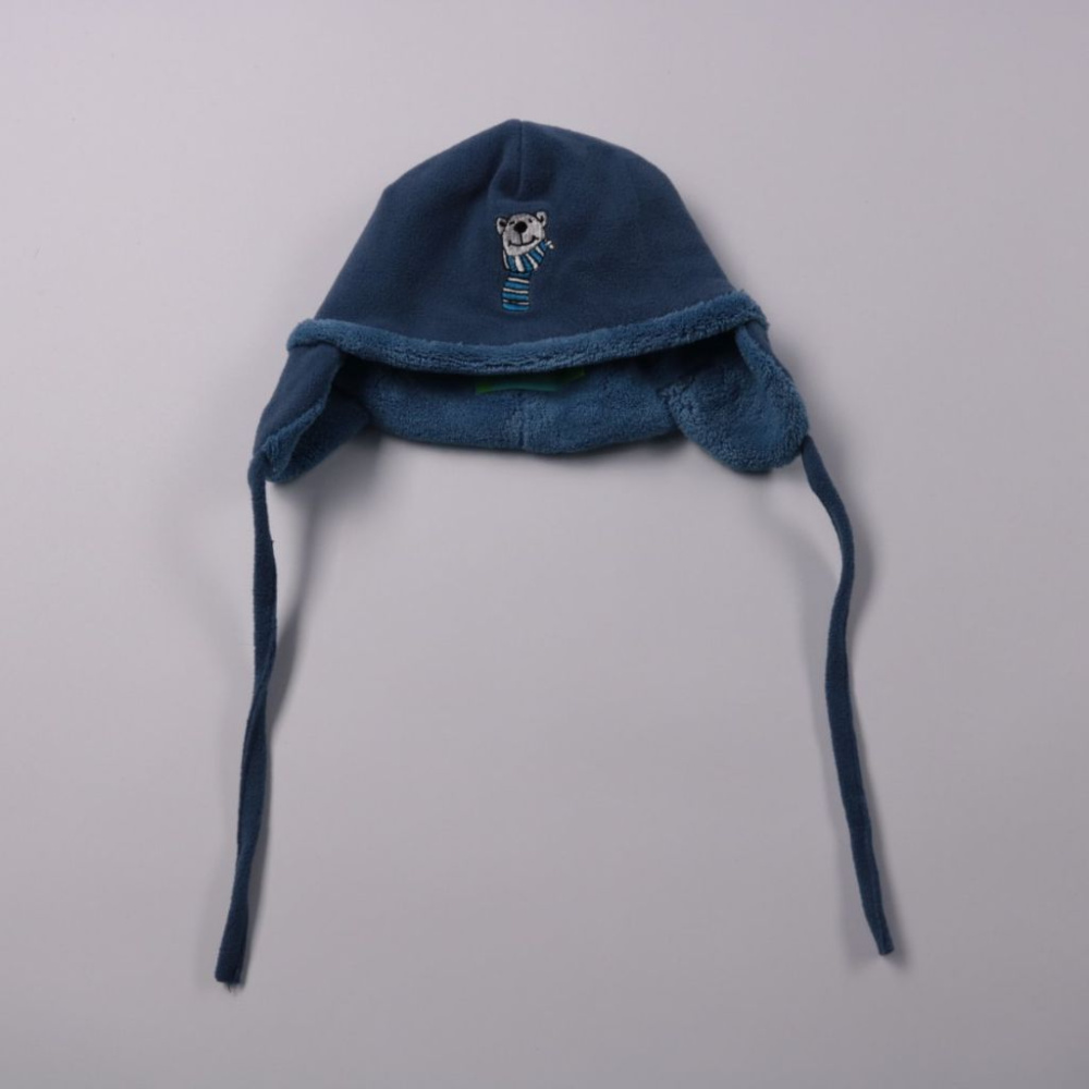 Детская зимняя шапка Kidswear синего цвета с ушками и завязками, украшена небольшой вышивкой. Подойдёт для прогулок в холодную погоду, хорошо закрывает уши. Мягкая флисовая ткань быстро сохнет и проста в уходе.