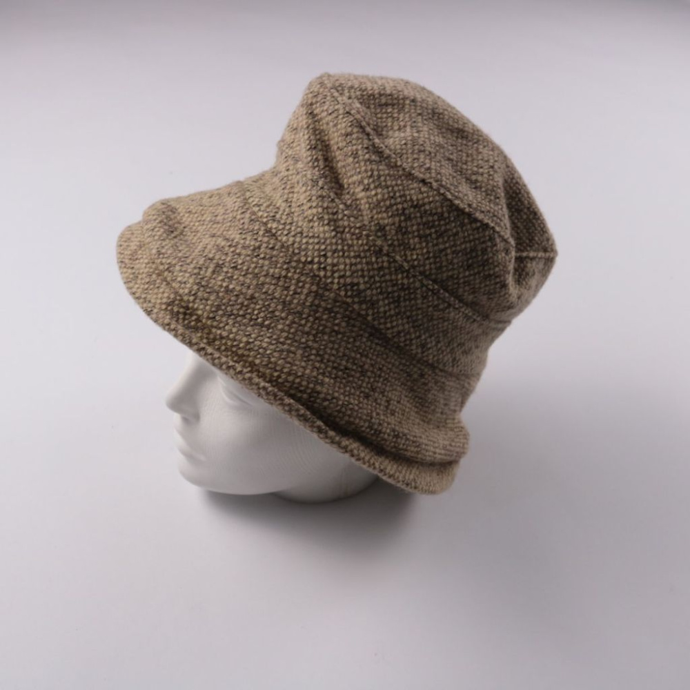 Панама из плотной текстурной ткани в бежево-коричневом оттенке. Подойдёт для прогулок и поездок в межсезонье, хорошо сочетается с повседневной одеждой. Широкие поля защищают лицо от ветра и лёгкого солнца.