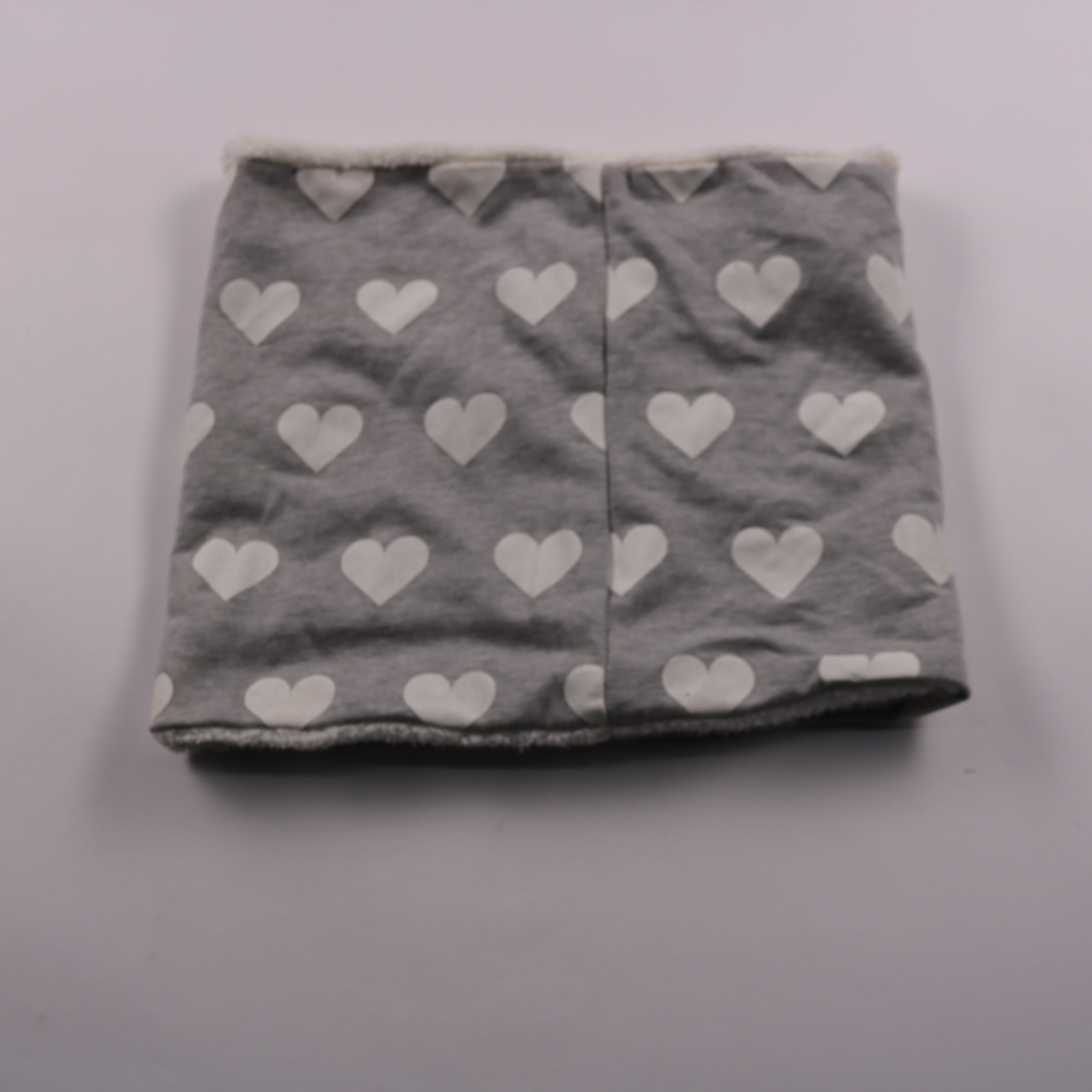 Тёплый снуд Sinsay серого цвета с принтом сердечек и мягкой меховой подкладкой. Подойдёт для зимних прогулок и поездок, хорошо закрывает шею от ветра. Удобен тем, что надевается без завязывания и не сползает.