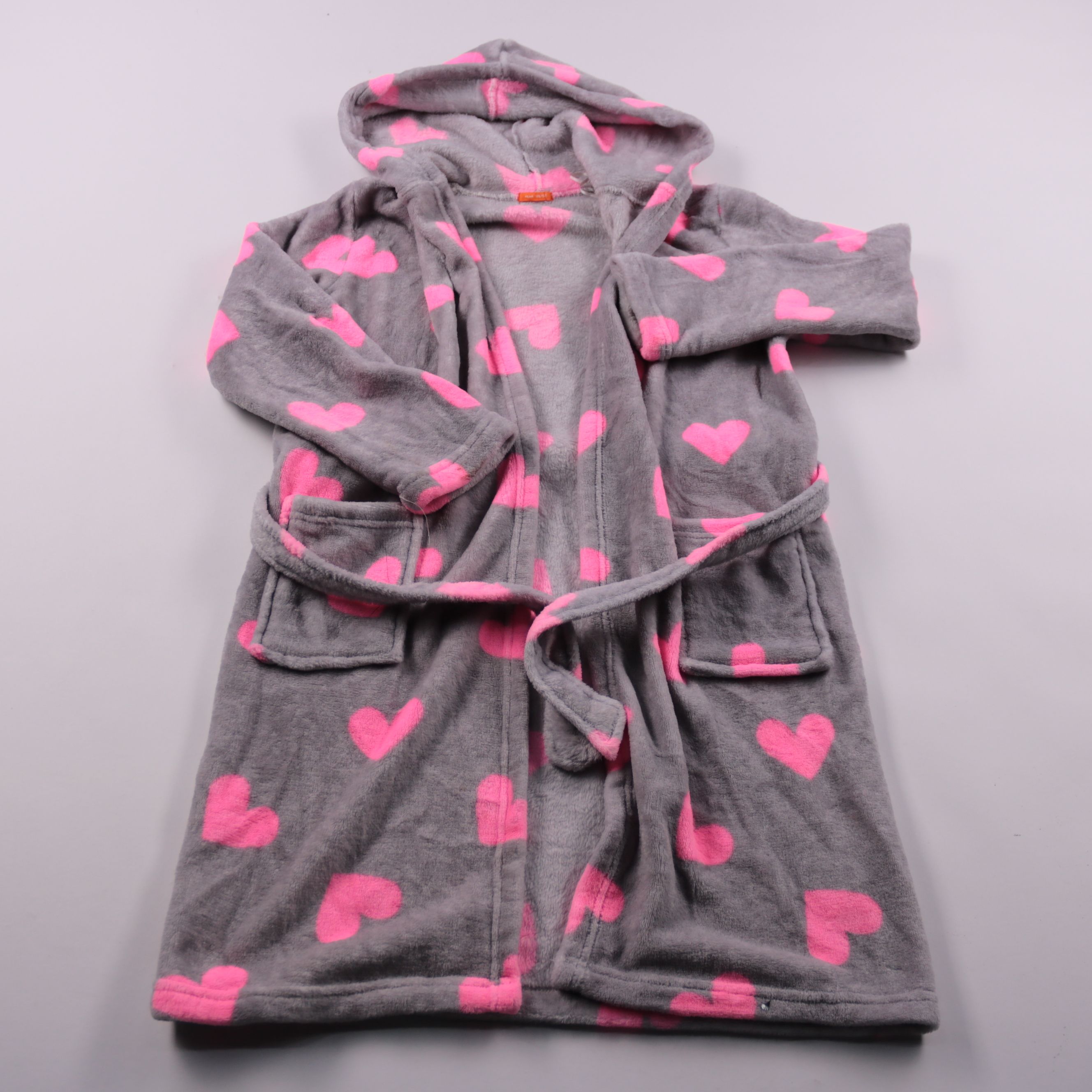 Детский флисовый халат HEMA серого цвета с розовыми сердечками, с капюшоном и поясом. Подойдёт для дома после ванны или на утро/вечер, когда нужно быстро согреться. Мягкий материал и карманы делают его удобным для повседневной носки.