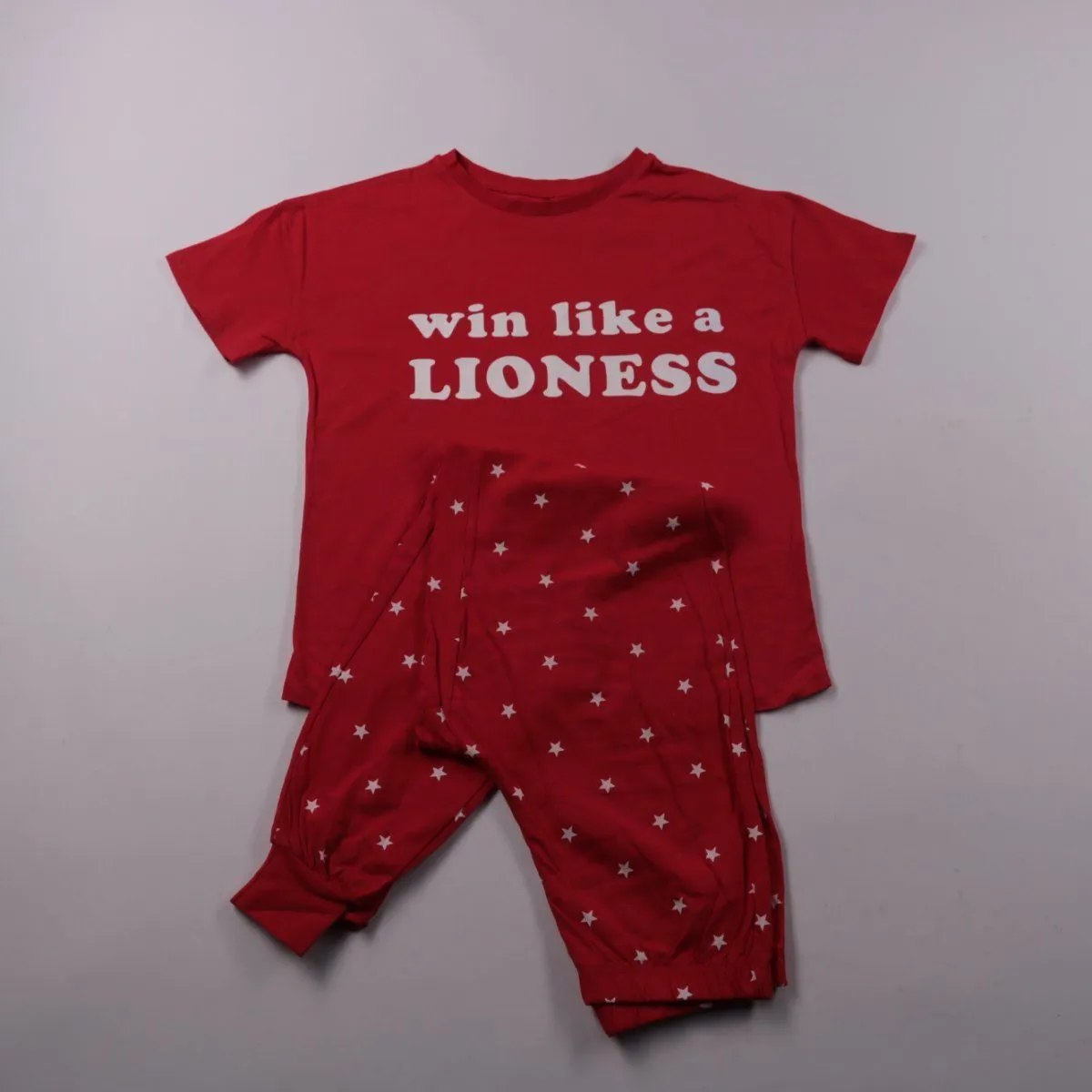 Хлопковая пижама George состоит из футболки с надписью и брюк со звёздами. Подойдёт для сна и домашнего отдыха в любое время года. Натуральная ткань хорошо пропускает воздух и проста в уходе.