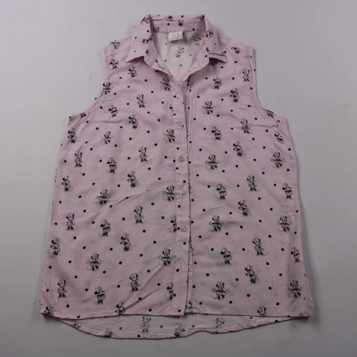 Розовая блузка без рукавов Disney с воротником и застёжкой на пуговицы, с принтом Minnie Mouse в горошек. Подойдёт для школы или прогулок в тёплую погоду, легко сочетать с юбкой, джинсами или шортами. Лёгкая ткань удобна в носке и быстро сохнет после стирки.