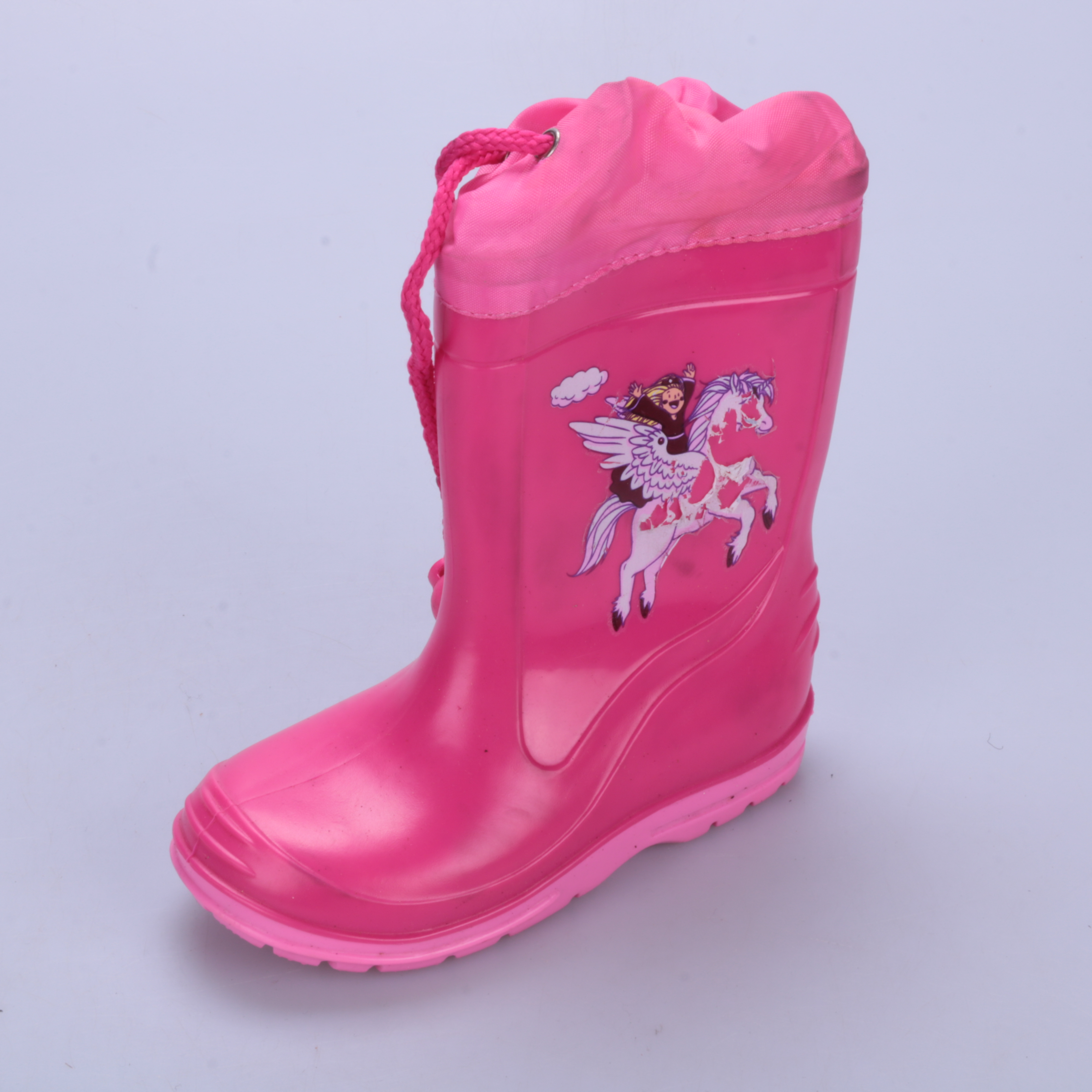 Резиновые сапоги для девочек ярко-розового цвета с принтом и утяжкой сверху. Подойдут для прогулок в дождь и слякоть в межсезонье. Легко моются и защищают ноги от влаги.