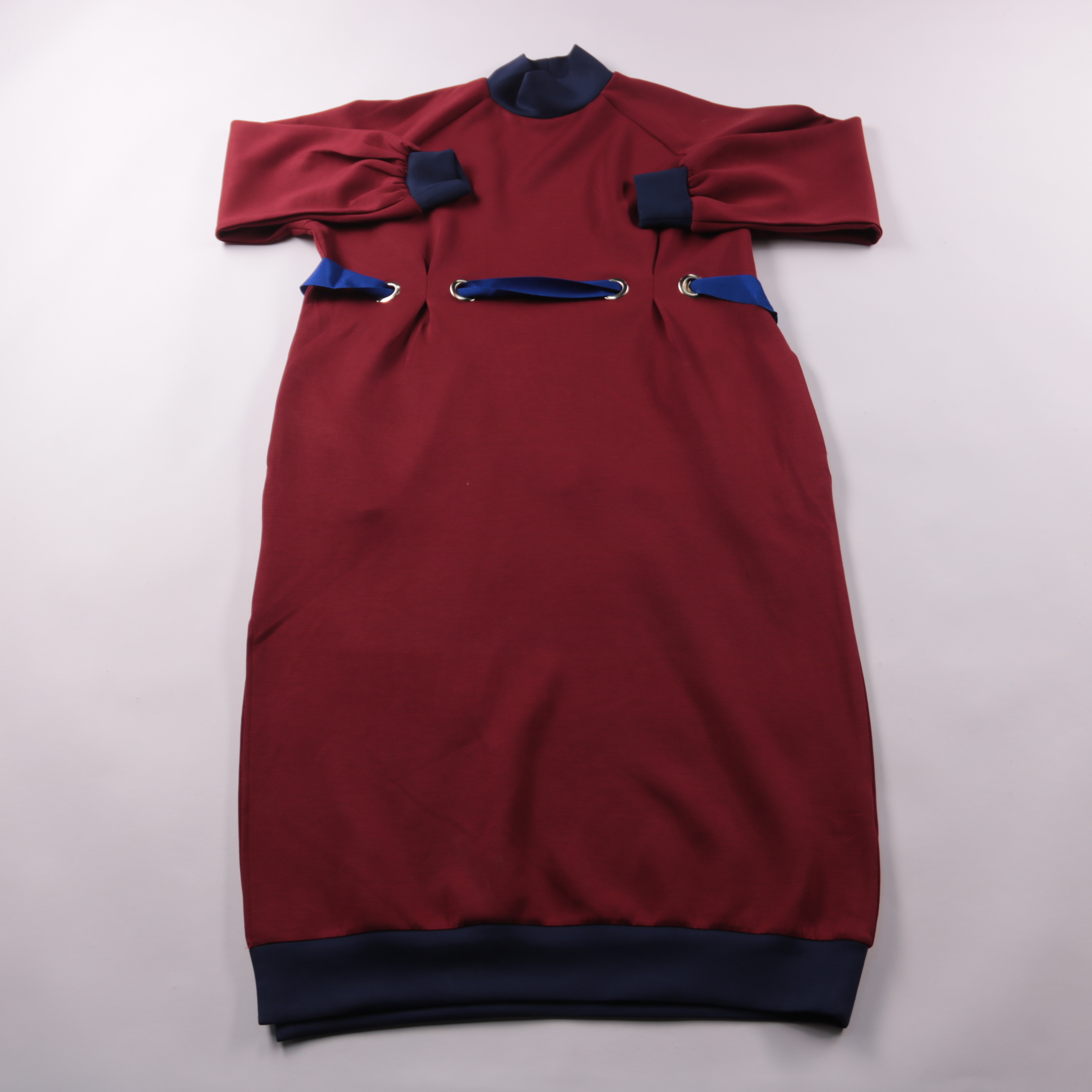 Платье George (коллаборация Roksanda) в бордовом цвете с контрастными синими манжетами и декоративными лентами на талии. Подойдёт для школы, прогулок и праздничных выходов, хорошо смотрится с колготками и кардиганом. Плотный трикотаж тянется и не сковы...