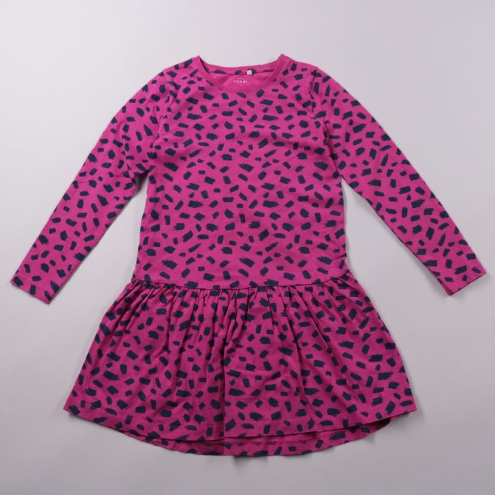 Платье Name It (линия basic needs) ярко-розового цвета с темно-синим пятнистым принтом и длинным рукавом. Подойдёт для повседневной носки в садик/школу и на прогулки в демисезон и зимой в помещении. Натуральный хлопок хорошо дышит и комфортен в носке.