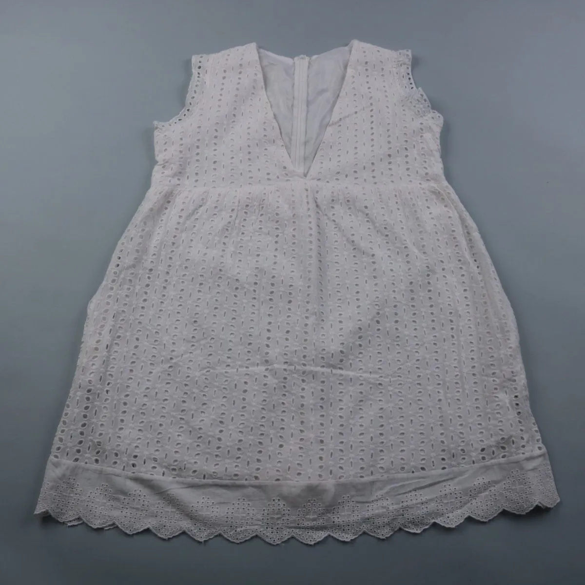 Белое хлопковое платье без рукавов с фактурной вышивкой (перфорация) и фигурной каймой по низу, застёгивается на молнию сзади. Подойдёт для лета, праздников и прогулок. Натуральный хлопок хорошо пропускает воздух и комфортен в жару.