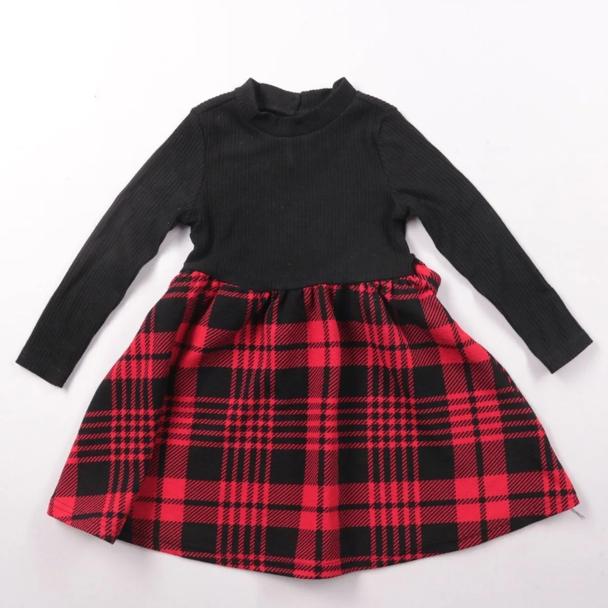 Платье SHEIN для девочки с длинным рукавом: чёрный ребристый верх и юбка в красно‑чёрную клетку. Подойдёт для прогулок, садика и праздничных выходов в прохладную погоду. Ткань с добавлением эластана тянется и не сковывает движения.