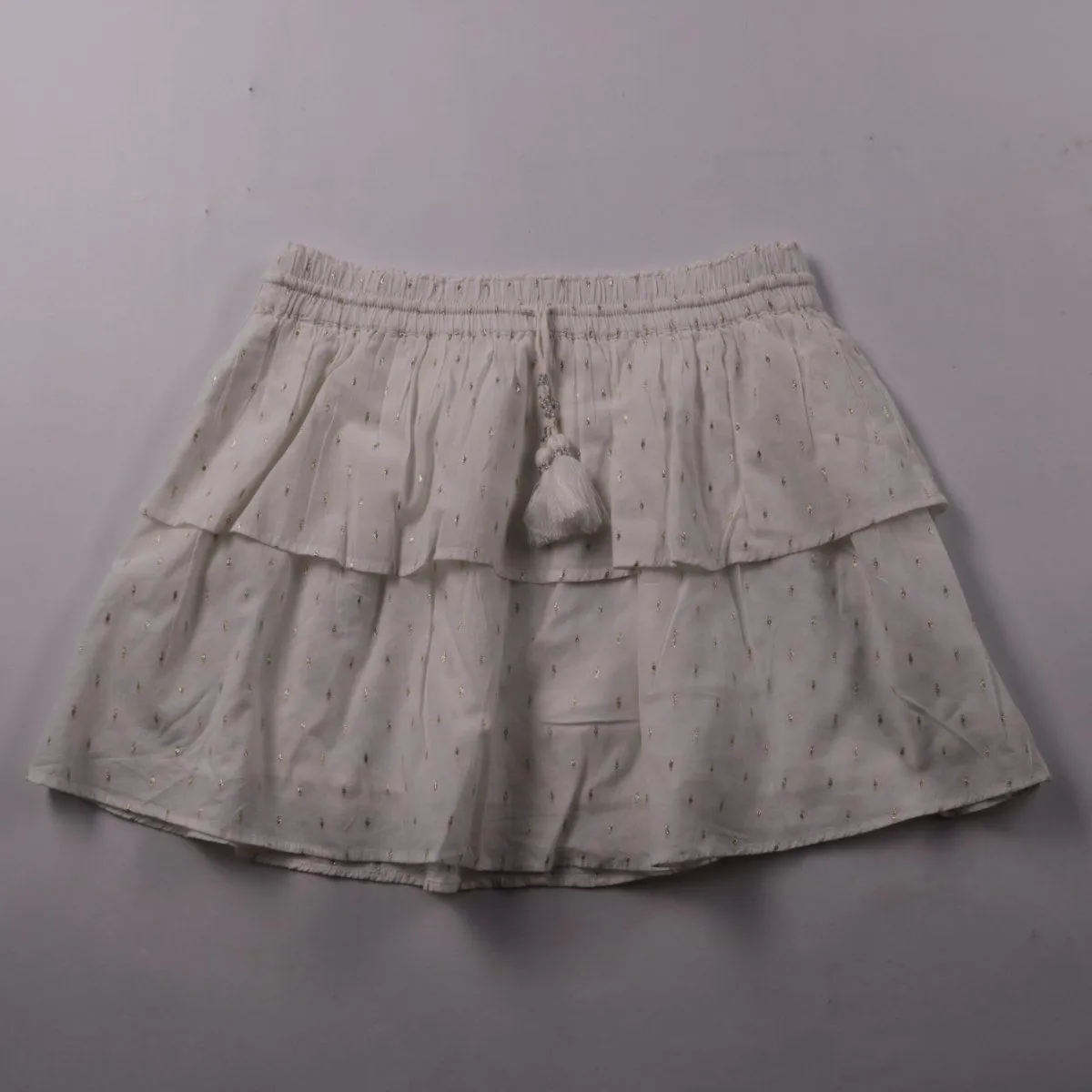 Юбка с ярусным воланом и эластичным поясом на кулиске с кисточками, цвет белый с золотистыми точками. Подойдёт для летних прогулок и праздничных образов, легко сочетается с футболками и блузками. Пояс регулируется шнурком, поэтому посадку удобно подогнать по талии.