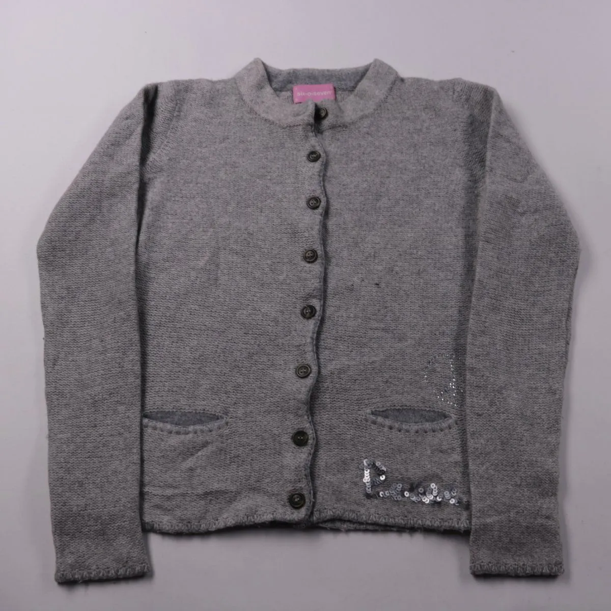 Вязаная кофта six-o-seven серого цвета на пуговицах, с карманами и декоративными пайетками. Подойдёт для прогулок и в детский сад/школу в прохладную погоду как второй слой. Пуговицы позволяют быстро надевать и снимать.