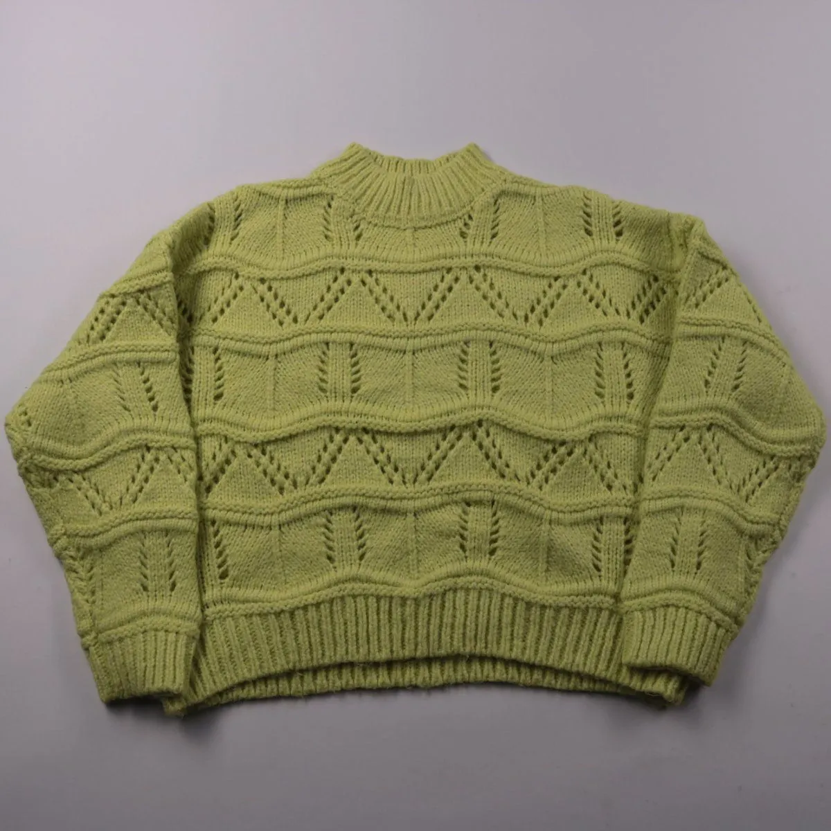 Вязаный свитер Primark светло‑зелёного цвета с ажурным узором и высоким воротником. Подойдёт для школы и прогулок в прохладную погоду, хорошо сочетается с джинсами и юбками. Мягкая пряжа и плотные манжеты помогают сохранять тепло и держать форму.