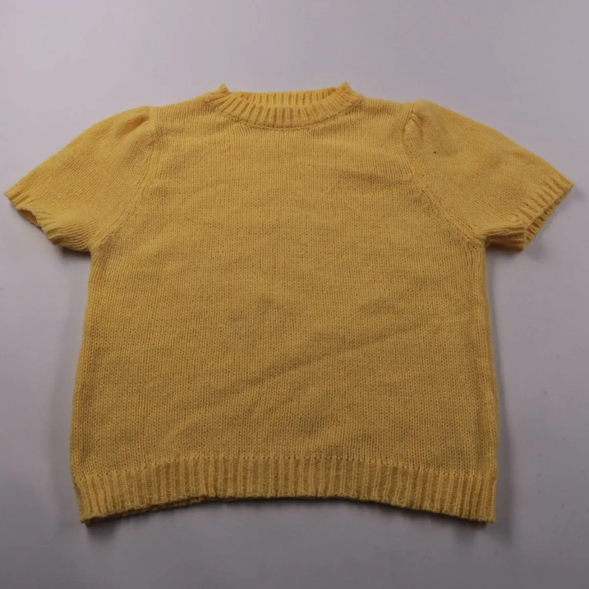 Вязаный свитер без бренда, жёлтого цвета, с коротким рукавом и мягкой резинкой по горловине и низу. Подойдёт для детского сада, прогулок и прохладной летней погоды, удобно носить с юбкой или брюками. Практичен тем, что легко сочетается с базовыми вещами и не сковывает движения.