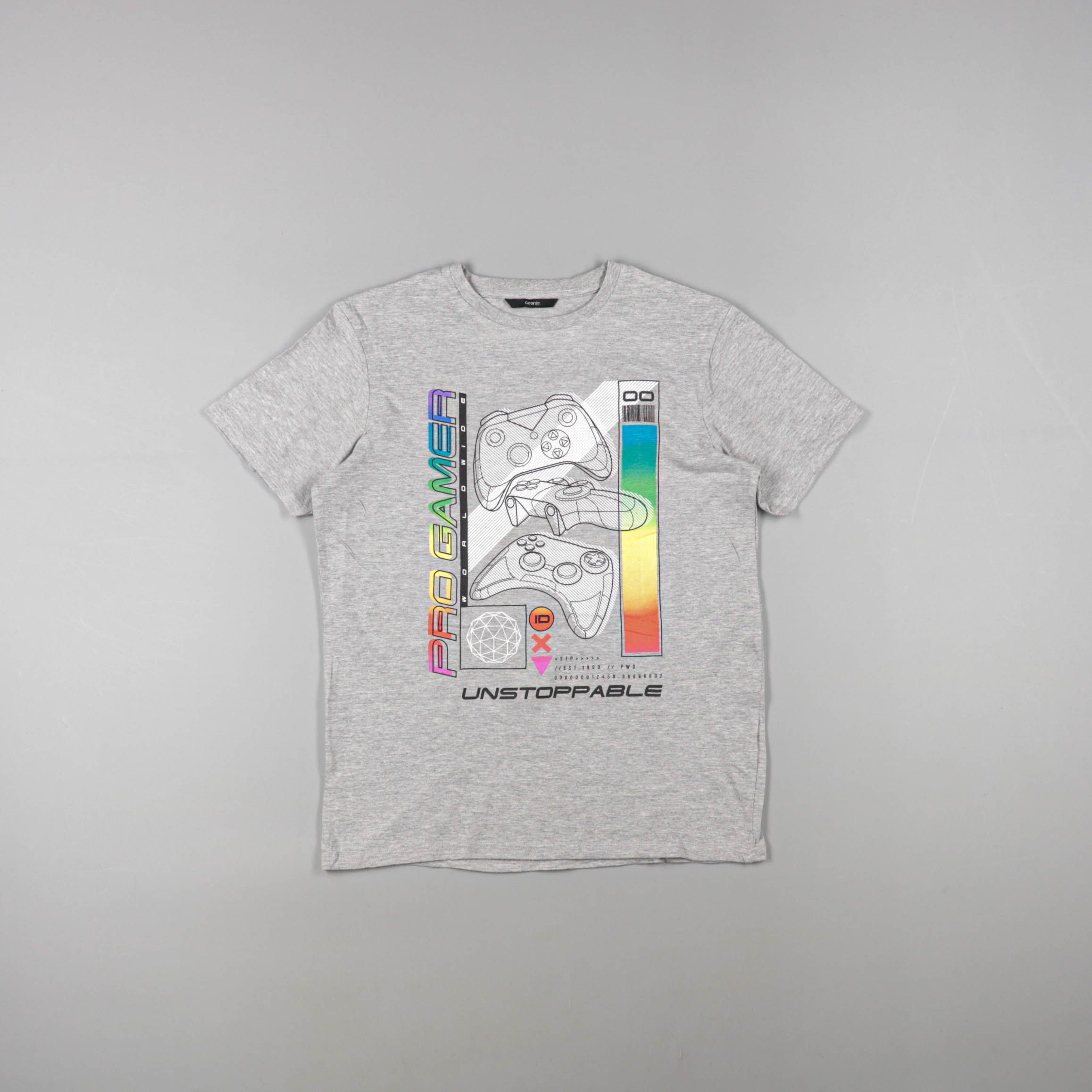 Футболка George серого меланжевого цвета с принтом «Pro Gamer» и геймпадами. Подойдёт для повседневной носки и игр/прогулок в тёплое время или как базовый слой под худи. Лёгкий трикотаж и короткий рукав удобны в движении и не стесняют ребёнка.