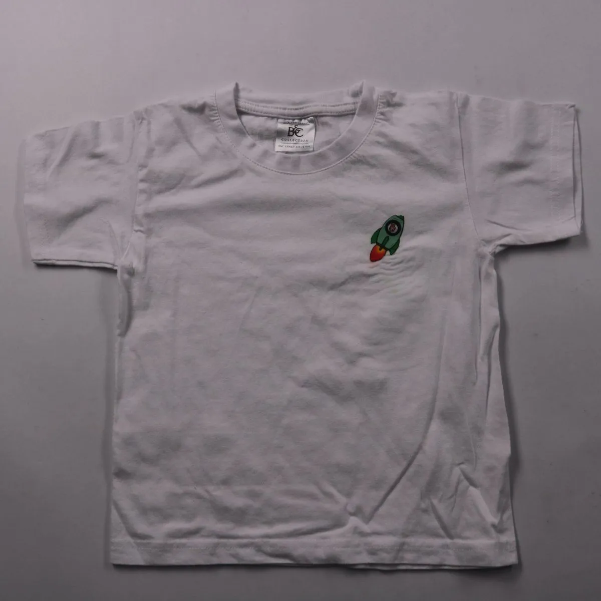 Футболка B&C для мальчика белого цвета с небольшим рисунком-ракетой на груди. Подойдёт для повседневной носки, детского сада и прогулок в тёплое время или как базовый слой круглый год. Лёгкий хлопковый материал комфортный и прост в уходе.