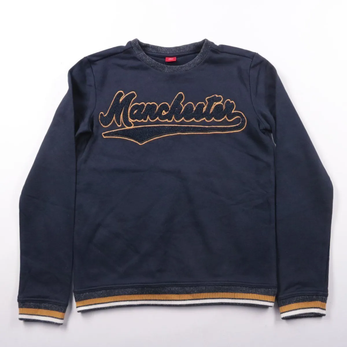 Свитер s.Oliver тёмно-синего цвета с объёмной вышитой надписью спереди и эластичными манжетами. Подойдёт для школы и прогулок в прохладную погоду как самостоятельный слой или под куртку. Ткань с высоким содержанием хлопка комфортная, а резинки по низу и на рукавах помогают лучше держать форму.