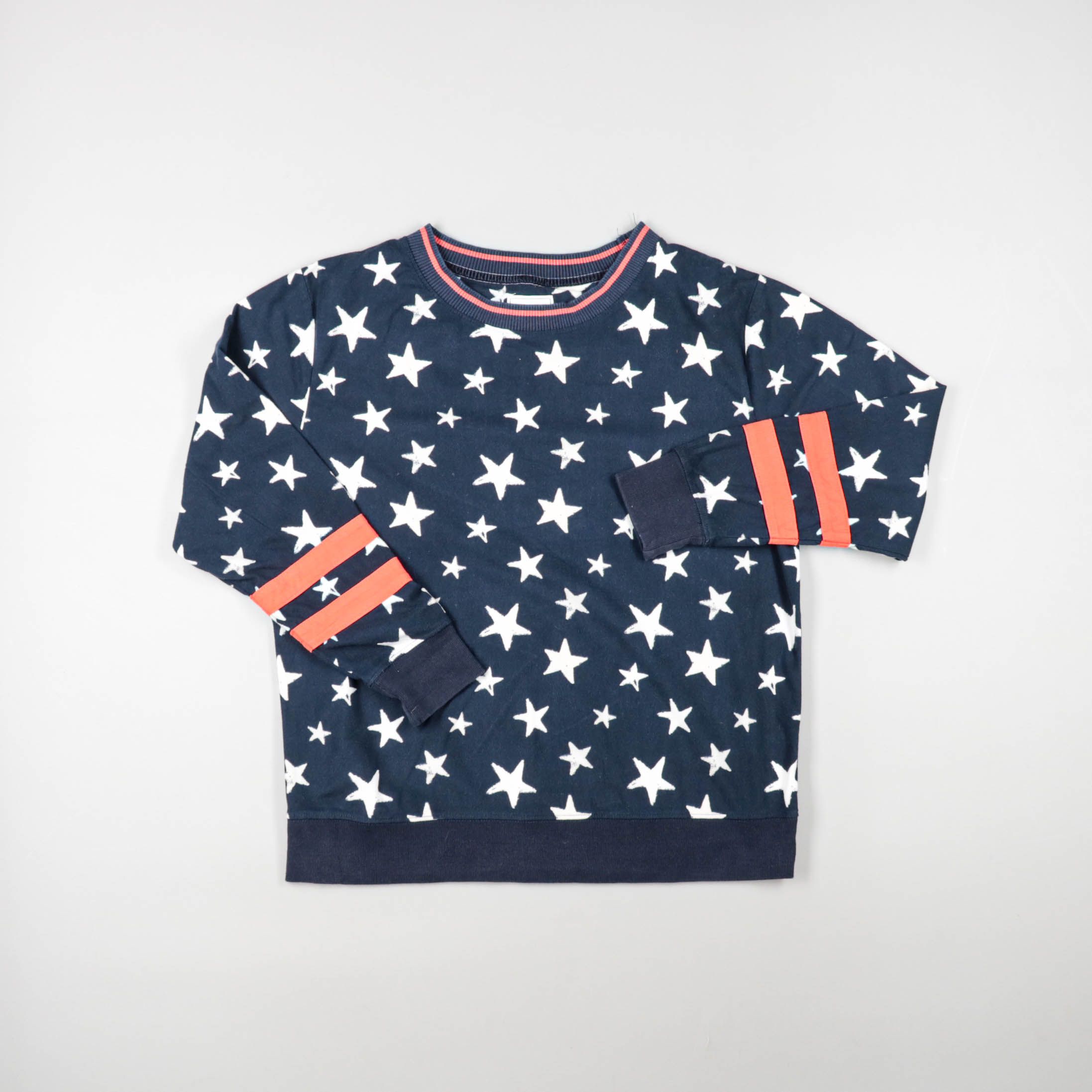 Детский свитшот с принтом белых звёзд на тёмно-синем фоне и оранжевыми полосами на рукавах, без капюшона. Подойдёт для прогулок и детского сада в прохладную погоду, легко сочетается с джинсами и спортивными брюками. Манжеты и пояс из плотной резинки по...