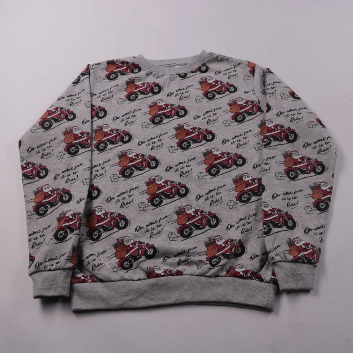 Толстовка Zeeman серого меланжа с принтом Деда Мороза на мотоцикле. Подойдёт для повседневной носки в школе и на прогулки в прохладную погоду. Мягкая ткань с добавлением полиэстера практична в уходе и быстрее сохнет после стирки.