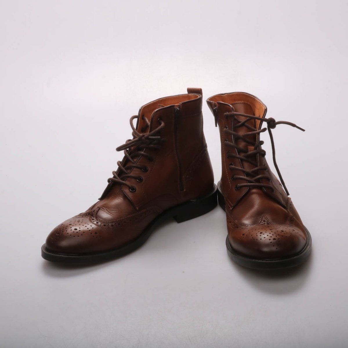 Мужские кожаные ботинки MNG коричневого цвета, на шнуровке с декоративной перфорацией (броги) и боковой молнией. Подойдут для повседневных и более аккуратных образов в прохладную погоду. Молния сбоку помогает быстро надевать и снимать обувь.