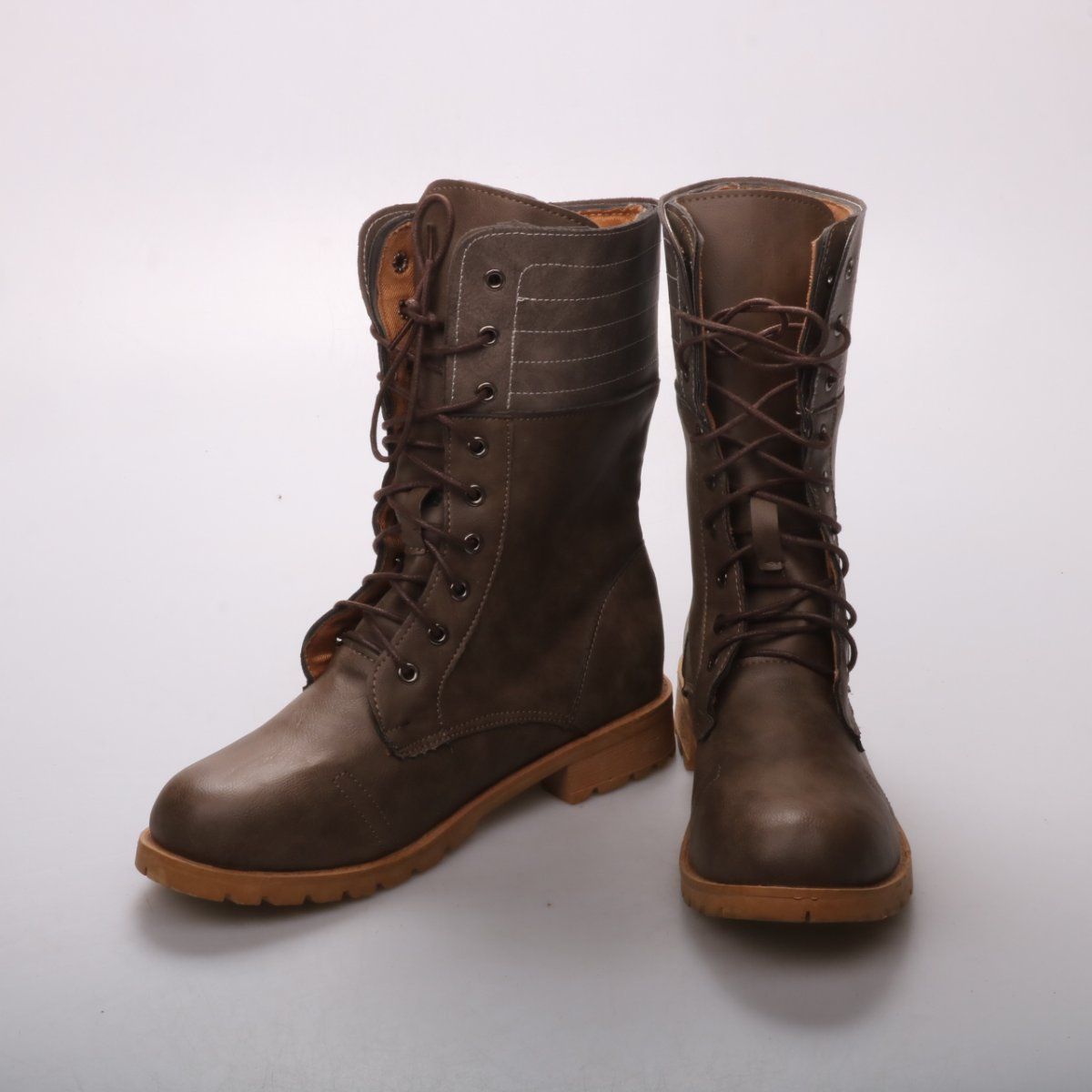 Высокие кожаные ботинки на шнуровке в коричневом цвете с контрастной рифлёной подошвой. Подойдут для повседневной носки в городе и на прогулках в прохладную погоду. Толстая подошва даёт хорошее сцепление и защищает от сырого асфальта.