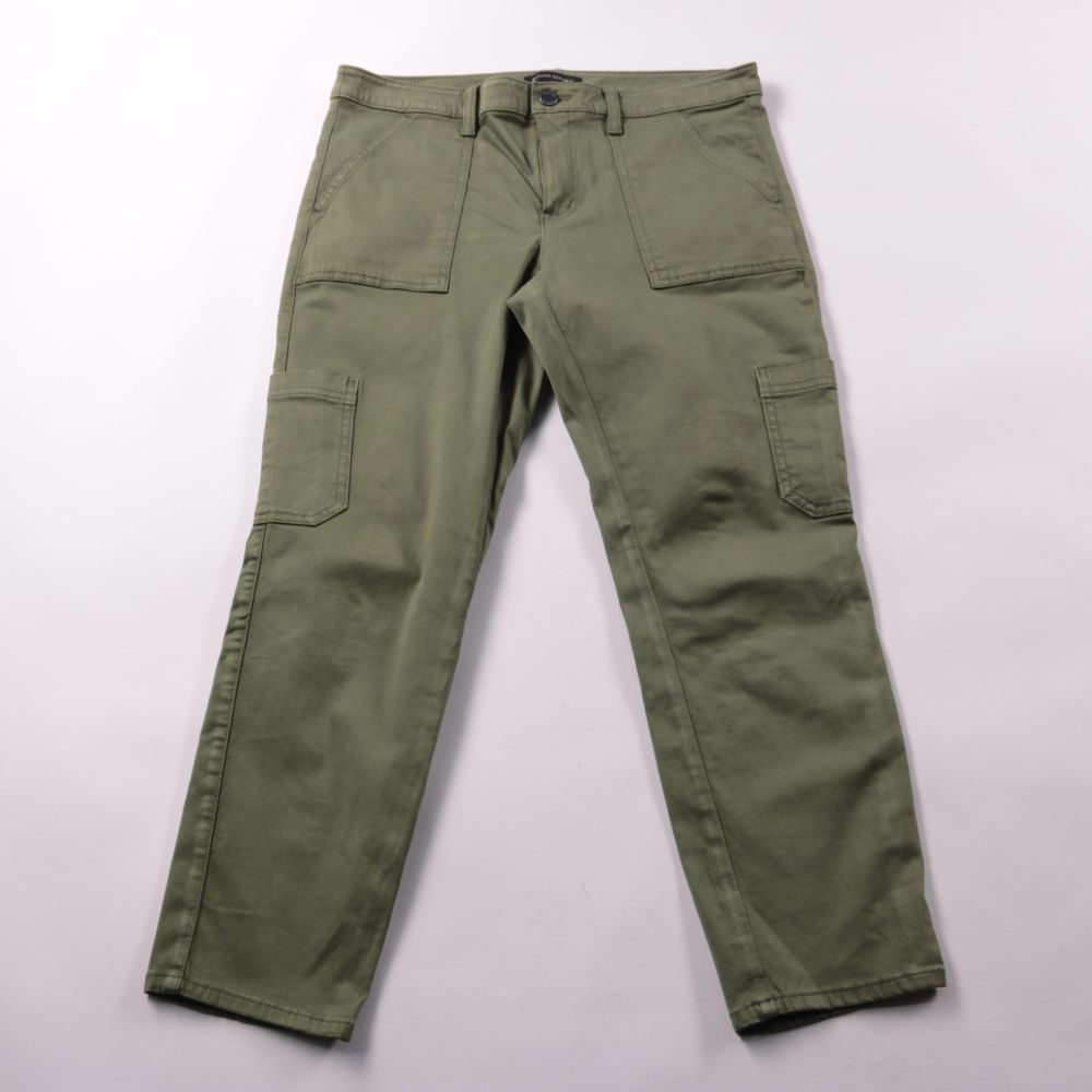 Мужские брюки Banana Republic в стиле карго, цвет хаки, с накладными и боковыми карманами. Подойдут для повседневной носки и прогулок в городе или на природе. Практичная ткань со спандексом даёт комфортную посадку и немного тянется.