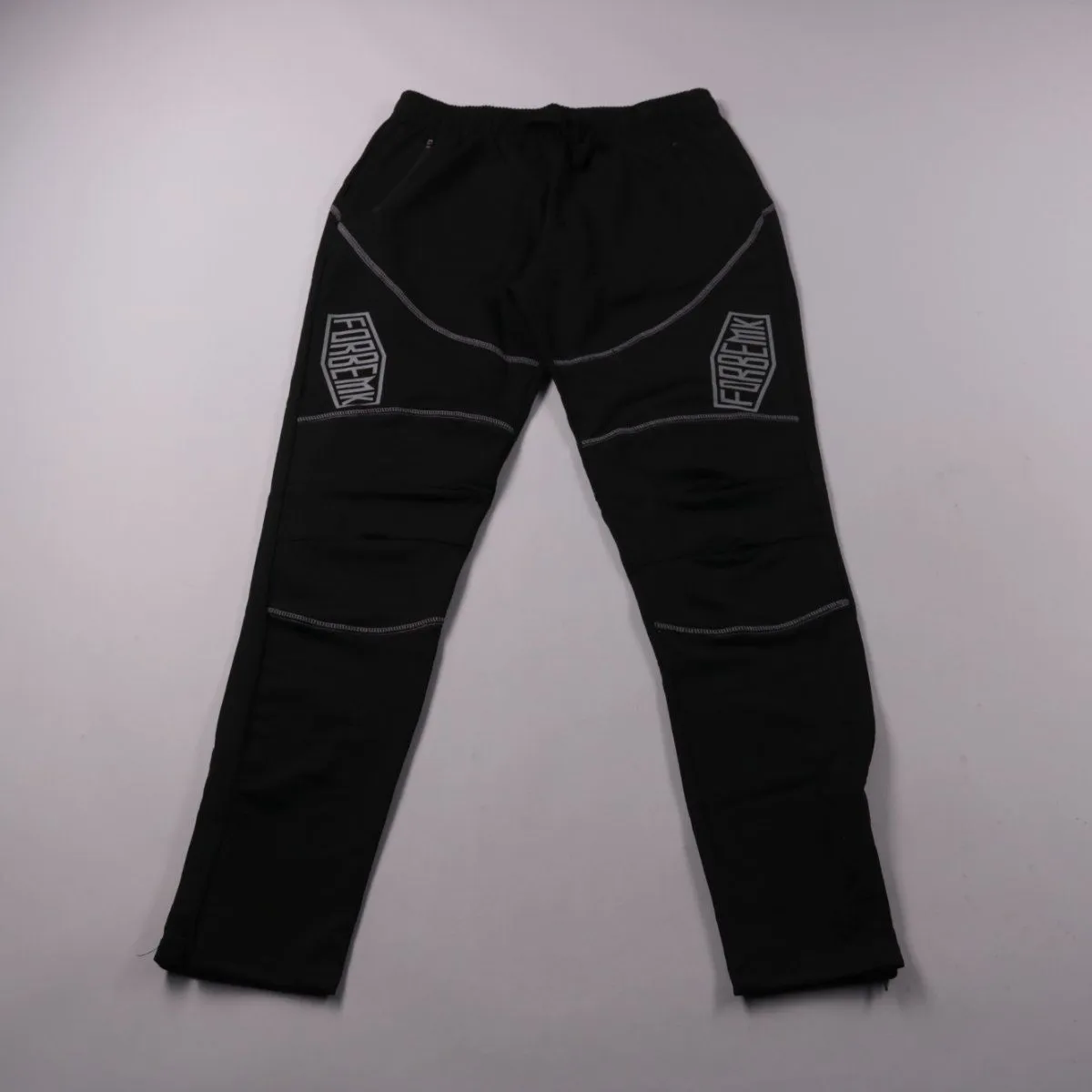Спортивные брюки/леггинсы FORBEMK чёрного цвета с эластичным поясом и декоративными швами, есть принты/светоотражающие элементы. Подойдут для тренировок, бега и активного отдыха в зале и на улице. Тянущийся материал хорошо садится по фигуре и быстро сохнет.