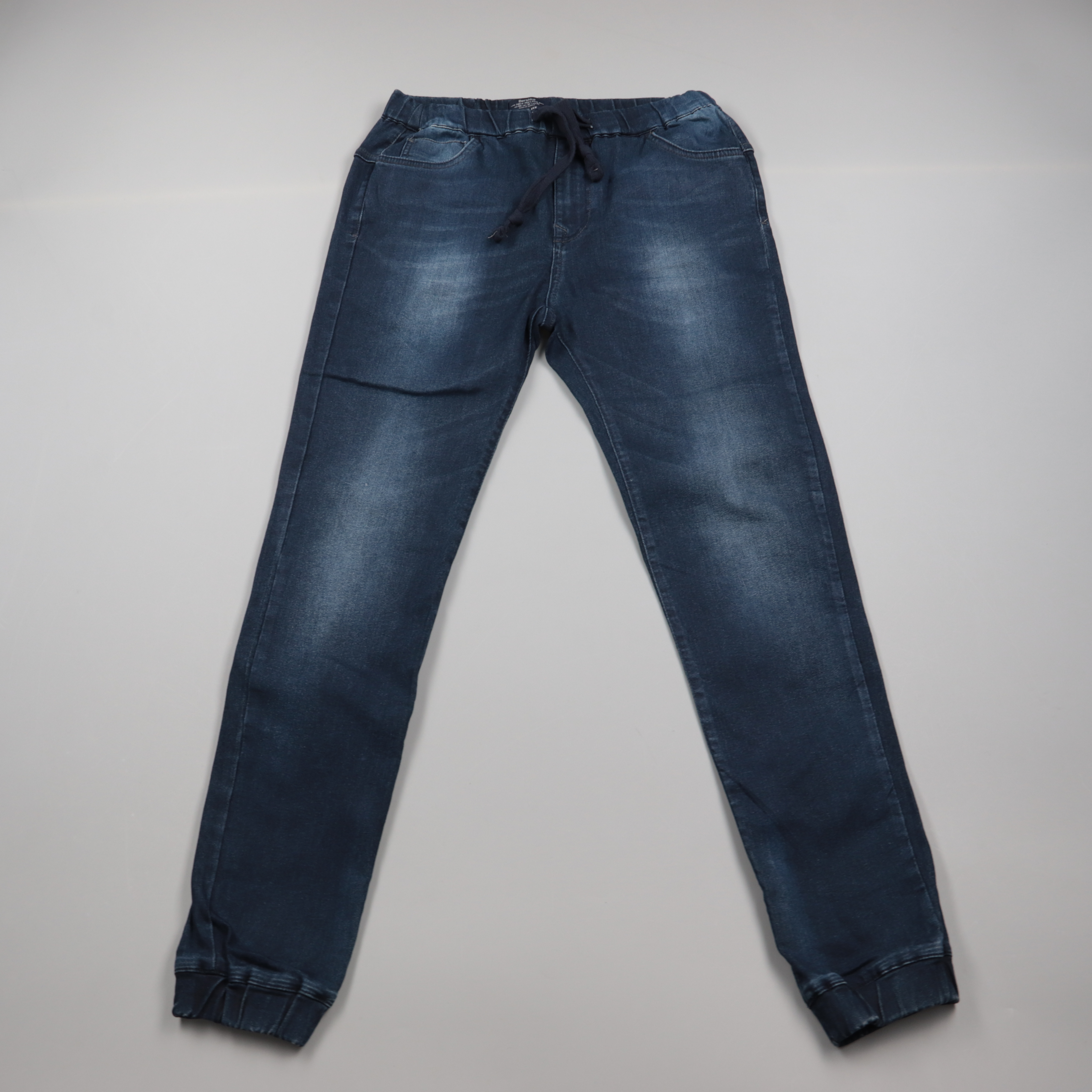 Мужские джинсы-джоггеры Bershka Jogger Fit тёмно-синего цвета с эластичным поясом на шнурке и манжетами снизу. Подойдут для повседневной носки и прогулок в городе, легко сочетаются с кедами и худи. Удобная посадка и тянущийся пояс дают комфорт в движении.