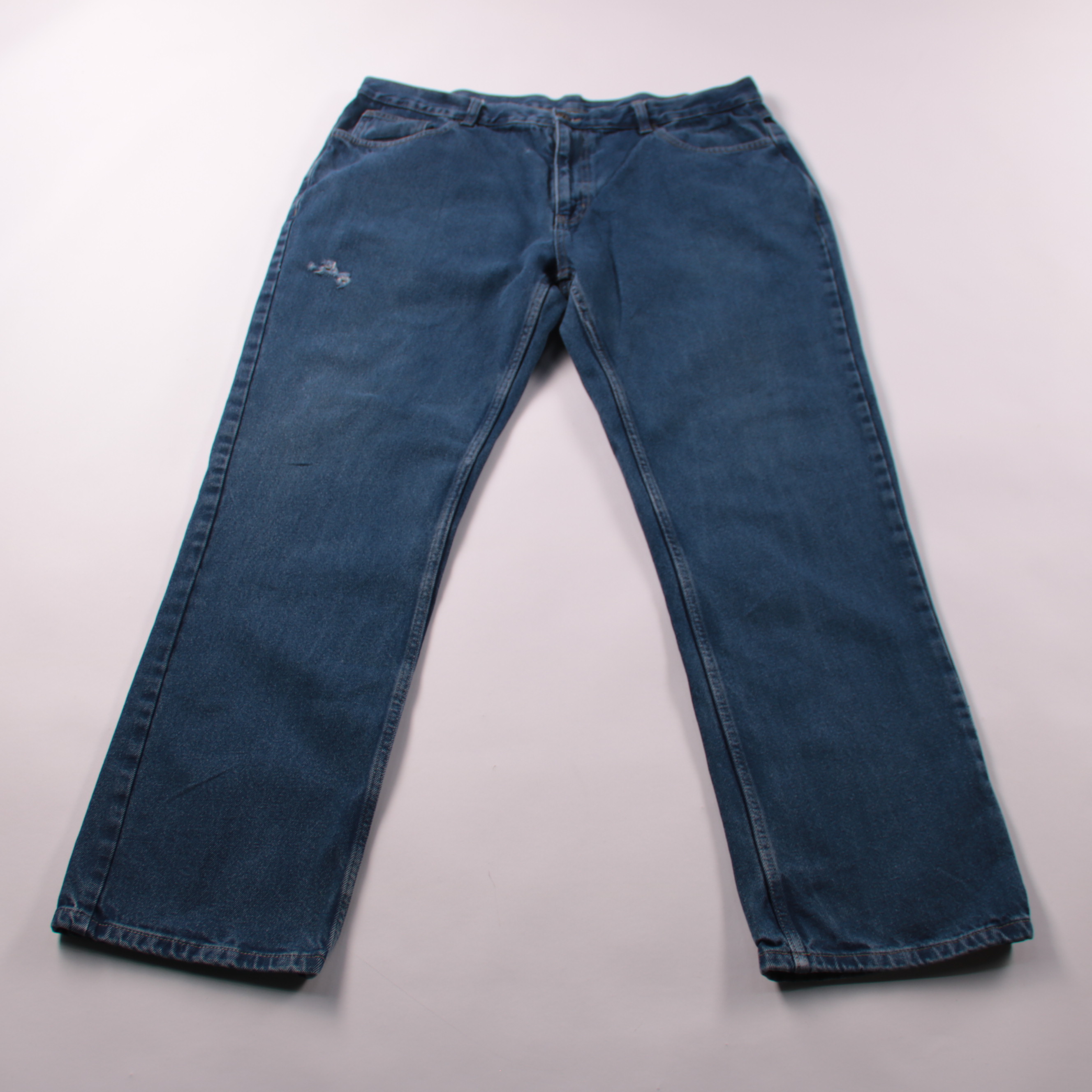 Мужские джинсы George из плотного хлопкового денима синего цвета. Подойдут на каждый день и для работы, есть небольшая потертость/зацеп на бедре. Прочный материал хорошо держит форму и рассчитан на регулярную носку.