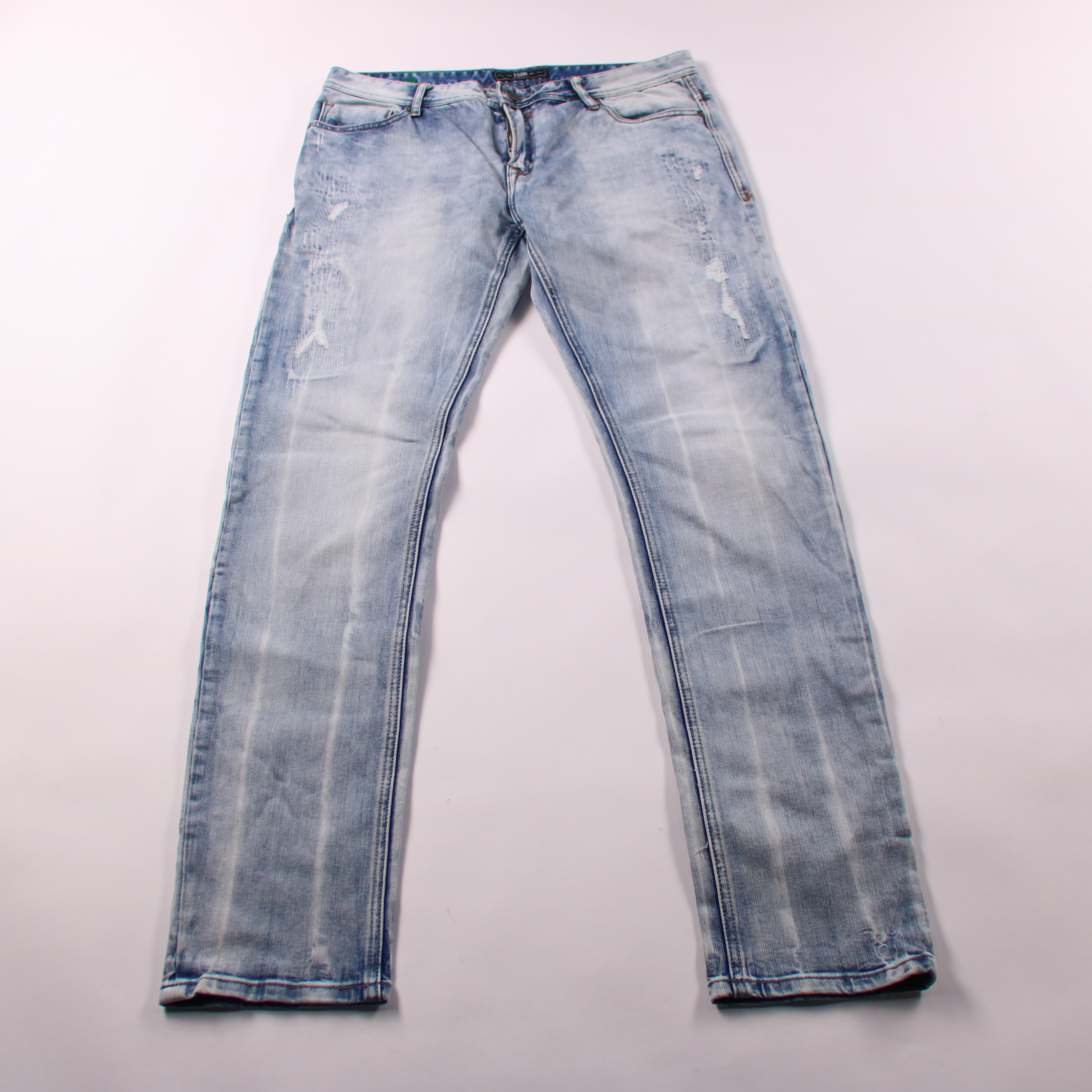 Мужские джинсы FSBN светло-голубого цвета с выраженными высветлениями и лёгкими потертостями. Подойдут для повседневных образов в стиле casual, хорошо сочетаются с футболками и худи. Плотный деним практичен в носке и не требует сложного ухода.