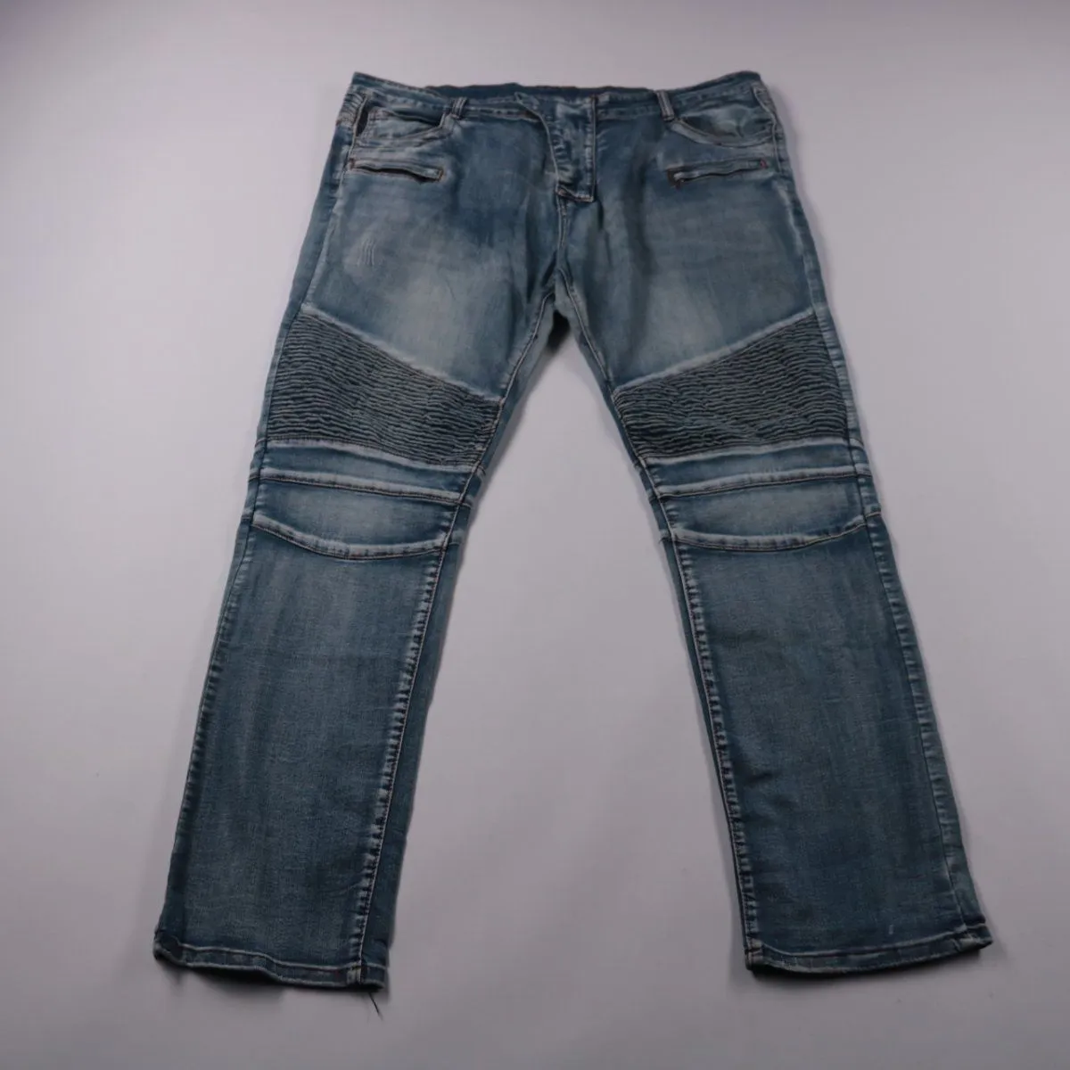 Мужские джинсы из синего денима с фактурными вставками на коленях и легким эффектом потертости. Подойдут для повседневной носки и неформальных образов в любое время года. Плотная ткань и усиленные зоны в области колен делают их более практичными в носке.