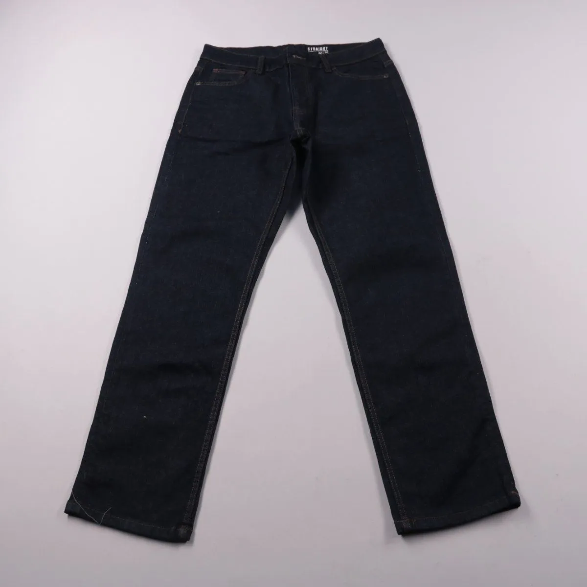 Мужские тёмно-синие джинсы прямого кроя Straight, размер производителя 32/30. Подойдут для повседневной носки и офиса с нестрогим дресс-кодом, хорошо сочетаются с футболками и рубашками. Плотный хлопковый деним с добавлением эластана даёт комфортную посадку и меньше мнётся.
