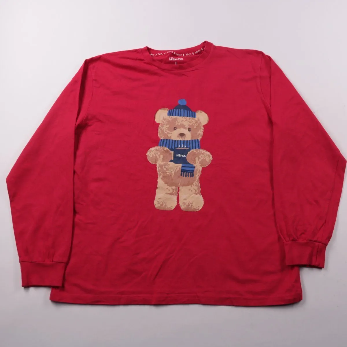 Лонгслив NSPCC красного цвета с принтом медвежонка в шапке и шарфе. Подойдёт для повседневной носки и домашнего отдыха, легко сочетается с джинсами и спортивными брюками. Хлопковая ткань приятна к телу и простая в уходе.