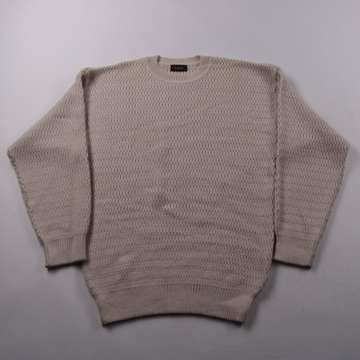 Мужской вязаный свитер Kalvin светло-бежевого цвета с фактурной вязкой и круглым вырезом. Подойдёт для повседневной носки в прохладную погоду, хорошо сочетается с джинсами и брюками. Смесь мериносовой шерсти с акрилом делает его тёплым и менее требовательным в уходе.