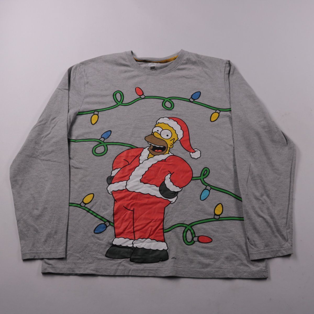 Серая мужская футболка с длинным рукавом The Simpsons с крупным принтом (Гомер в новогоднем костюме и гирлянда). Подойдёт для повседневной носки и праздничных образов в зимний сезон. Трикотажный материал удобен и легко сочетается с джинсами и брюками.