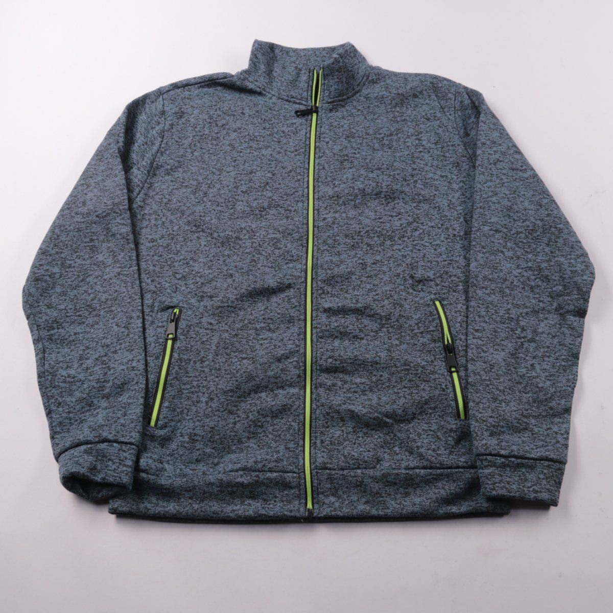 Мужская толстовка SIMHW'RSS на молнии с воротником-стойкой, серого меланжевого цвета с салатовыми молниями. Подойдёт для повседневной носки и как второй слой в прохладную погоду. Есть карманы на молнии — удобно хранить мелочи.