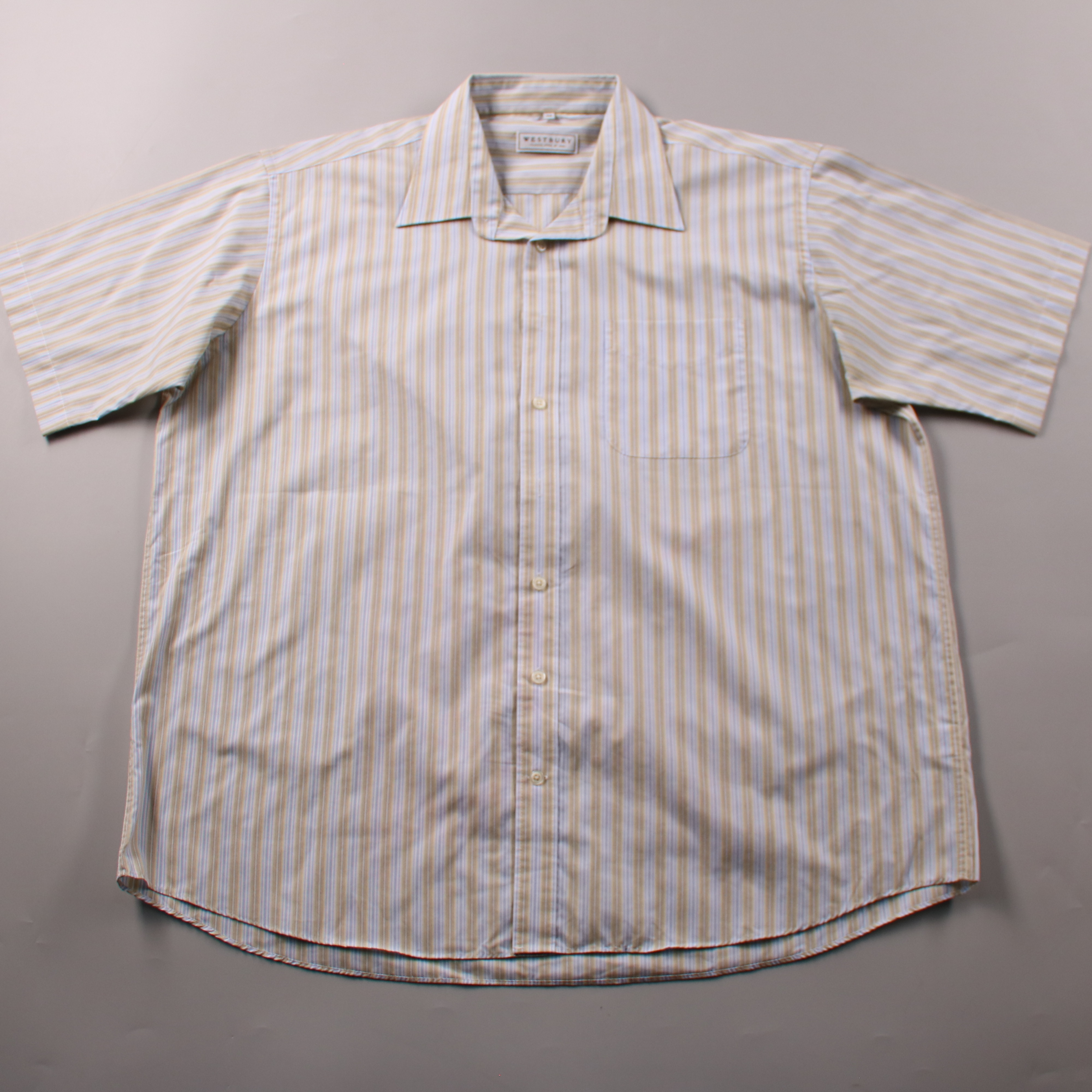 Мужская рубашка Westbury в светлой полоску (бежево-голубые тона), с коротким рукавом и нагрудным карманом. Подойдёт для офиса в casual-формате и на каждый день летом или как базовый слой в демисезон. Натуральный хлопок хорошо дышит и комфортен в носке.