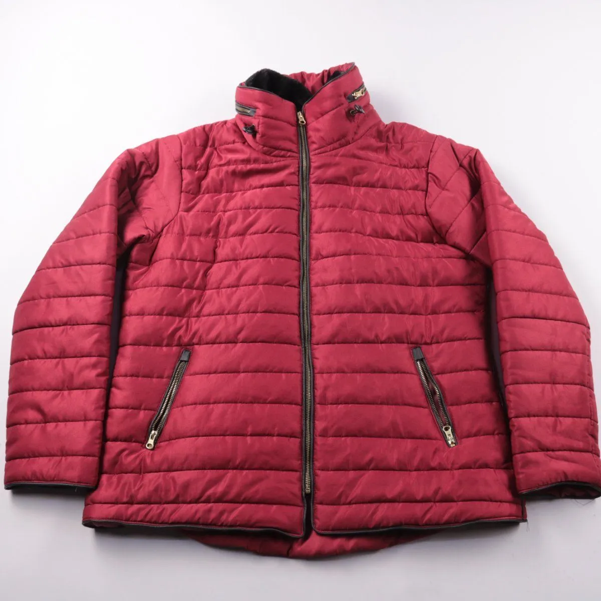 Стёганая мужская куртка без бренда, бордового цвета, с воротником-стойкой и застёжкой на молнию. Подойдёт для прохладной погоды весной и осенью, на каждый день. Практичные карманы на молниях и утеплённый воротник помогают сохранить тепло и удобно хранить мелочи.