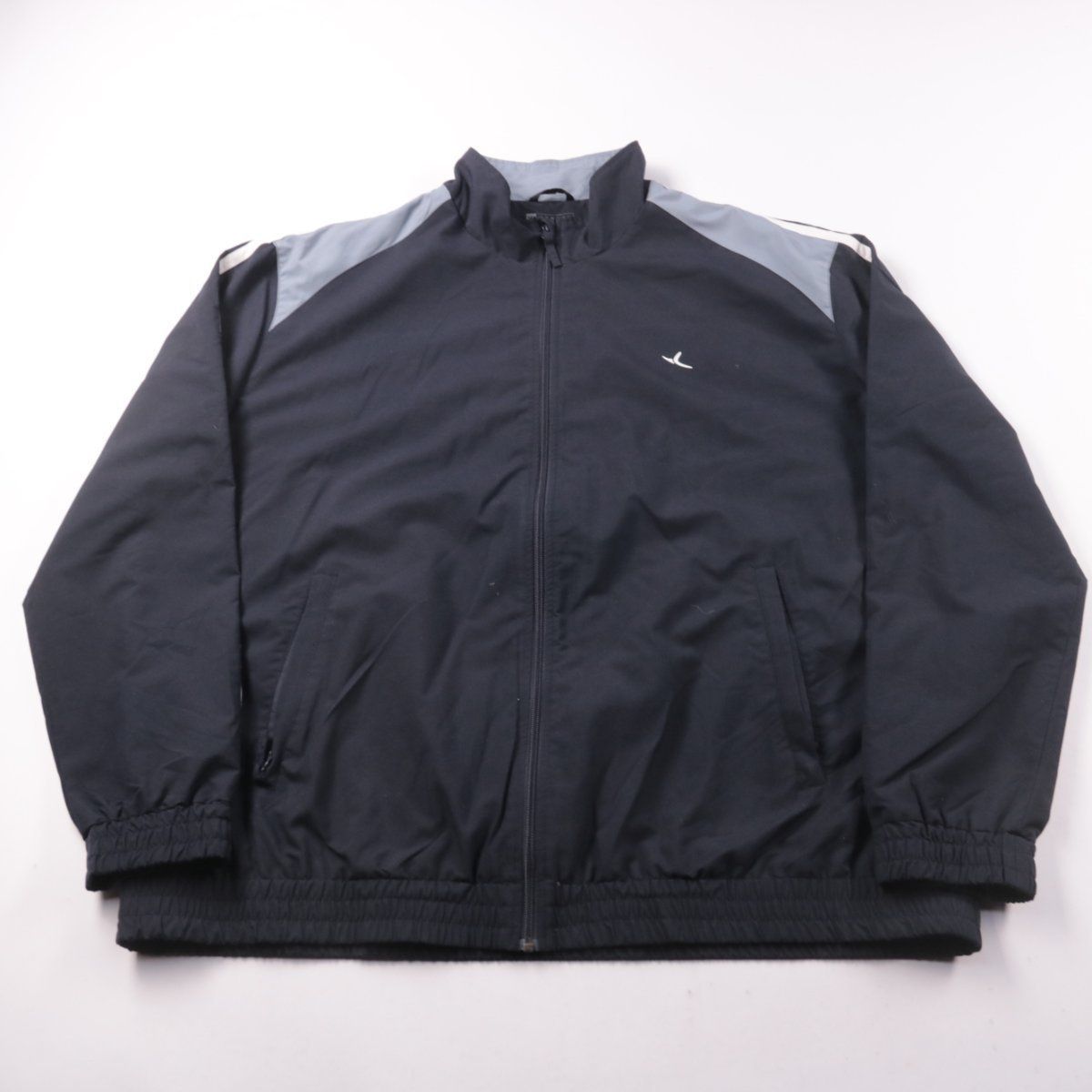 Мужская ветровка Domyos чёрного цвета с серыми вставками на плечах, на молнии и со стойкой-воротником. Подойдёт для тренировок и повседневной носки в прохладную погоду. Лёгкая и быстро сохнет, есть удобные боковые карманы.