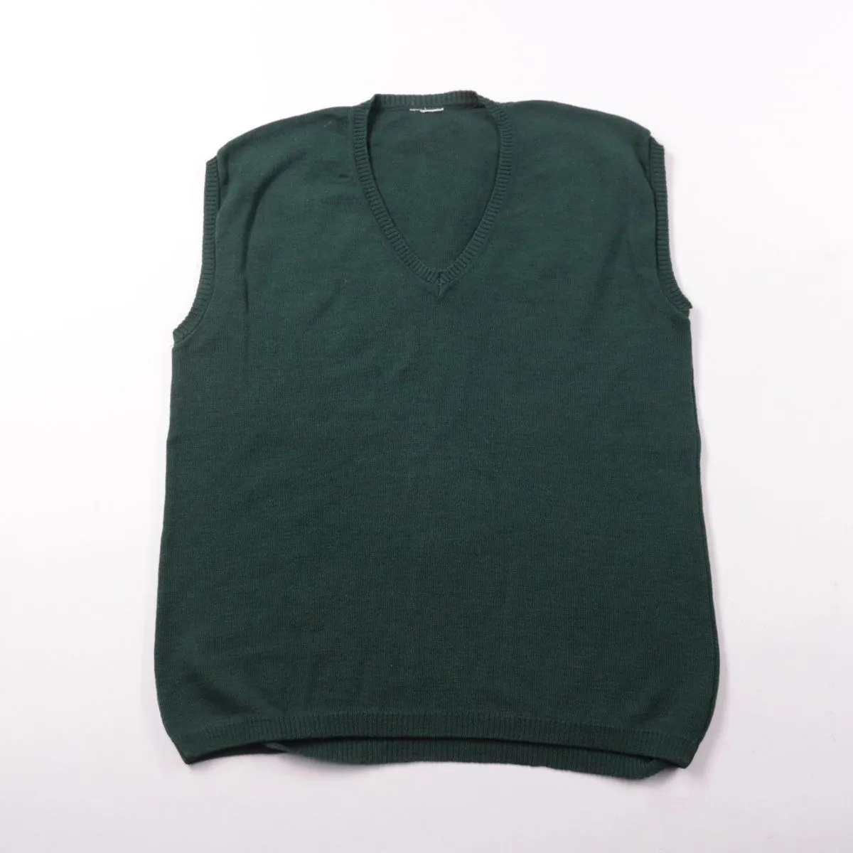 Вязаный жилет  с V-образным вырезом, однотонный тёмно-зелёного цвета. Подойдёт для школы и повседневной носки поверх рубашки или водолазки. Практичен тем, что легко сочетается и не стесняет движения.