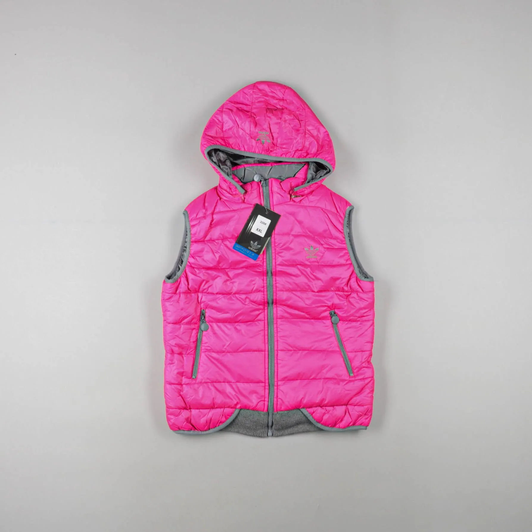 Стёганый жилет Adidas с капюшоном, на молнии, ярко‑розового цвета с серой окантовкой и двумя карманами на молниях. Подойдёт для прохладной весны/осени и для многослойных образов поверх худи или свитера. Лёгкий и компактный, удобно брать с собой в поездки.