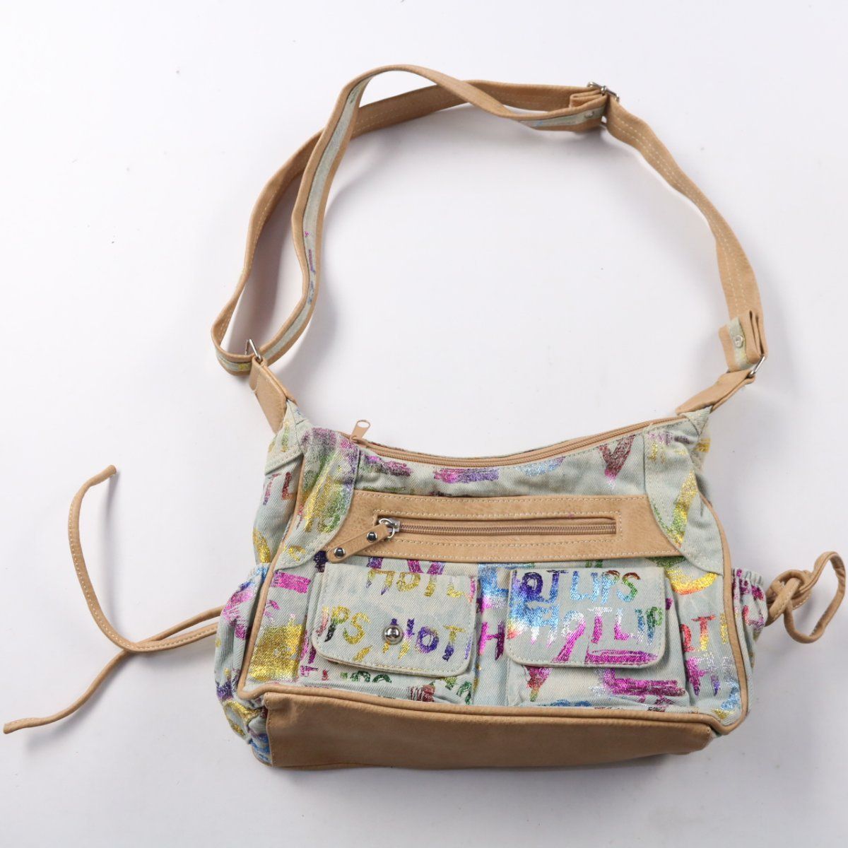 Сумка кросс-боди с ярким разноцветным принтом и бежевой отделкой, бренд не указан. Подойдёт для повседневных прогулок и города, есть внешние карманы и основное отделение на молнии. Регулируемый ремень позволяет носить на плече или через плечо.
