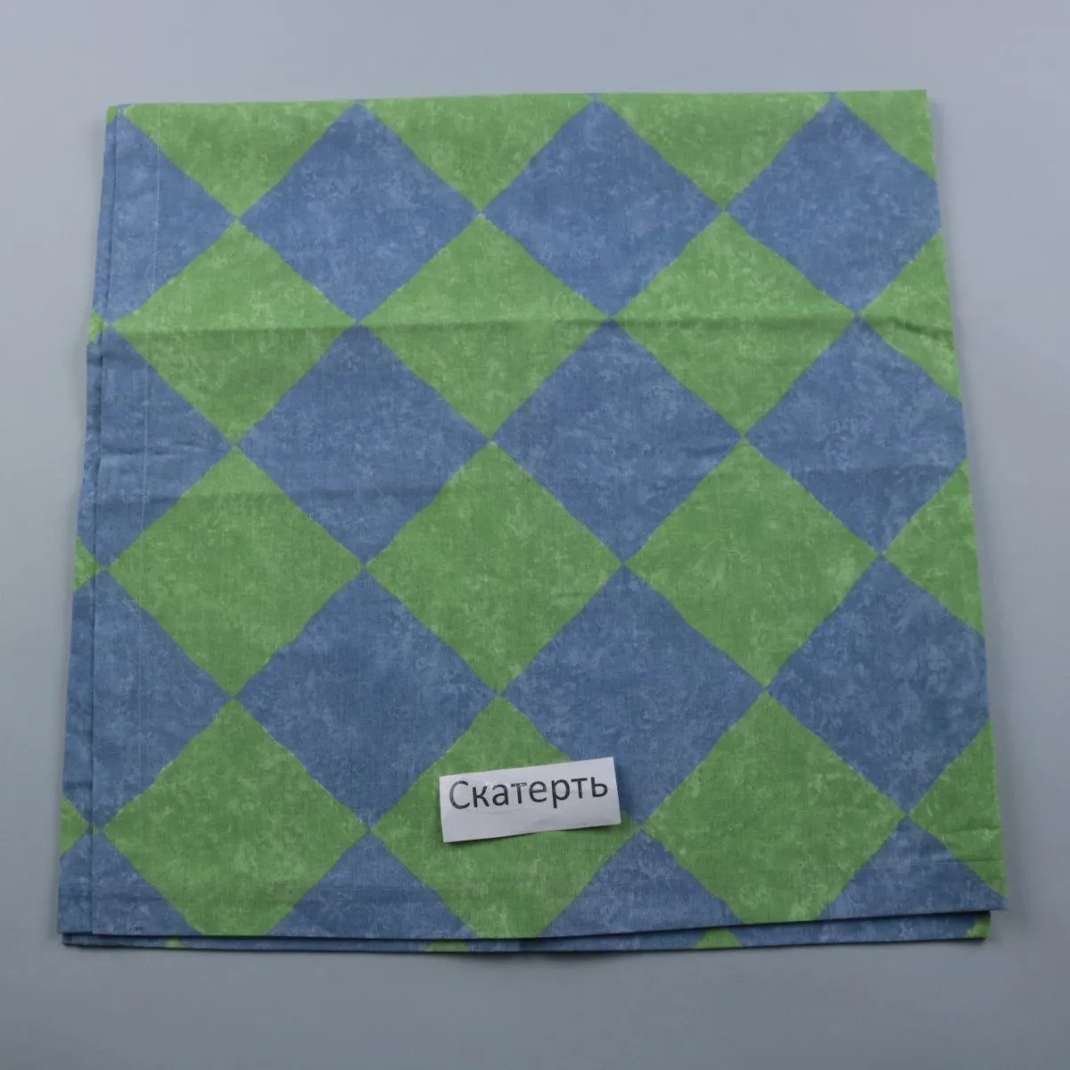 Скатерть с ромбовидным рисунком в зелёно-синих тонах, подойдёт для кухонного или дачного стола. Уместна для повседневной сервировки и семейных обедов. Легко складывается и не занимает много места при хранении.
