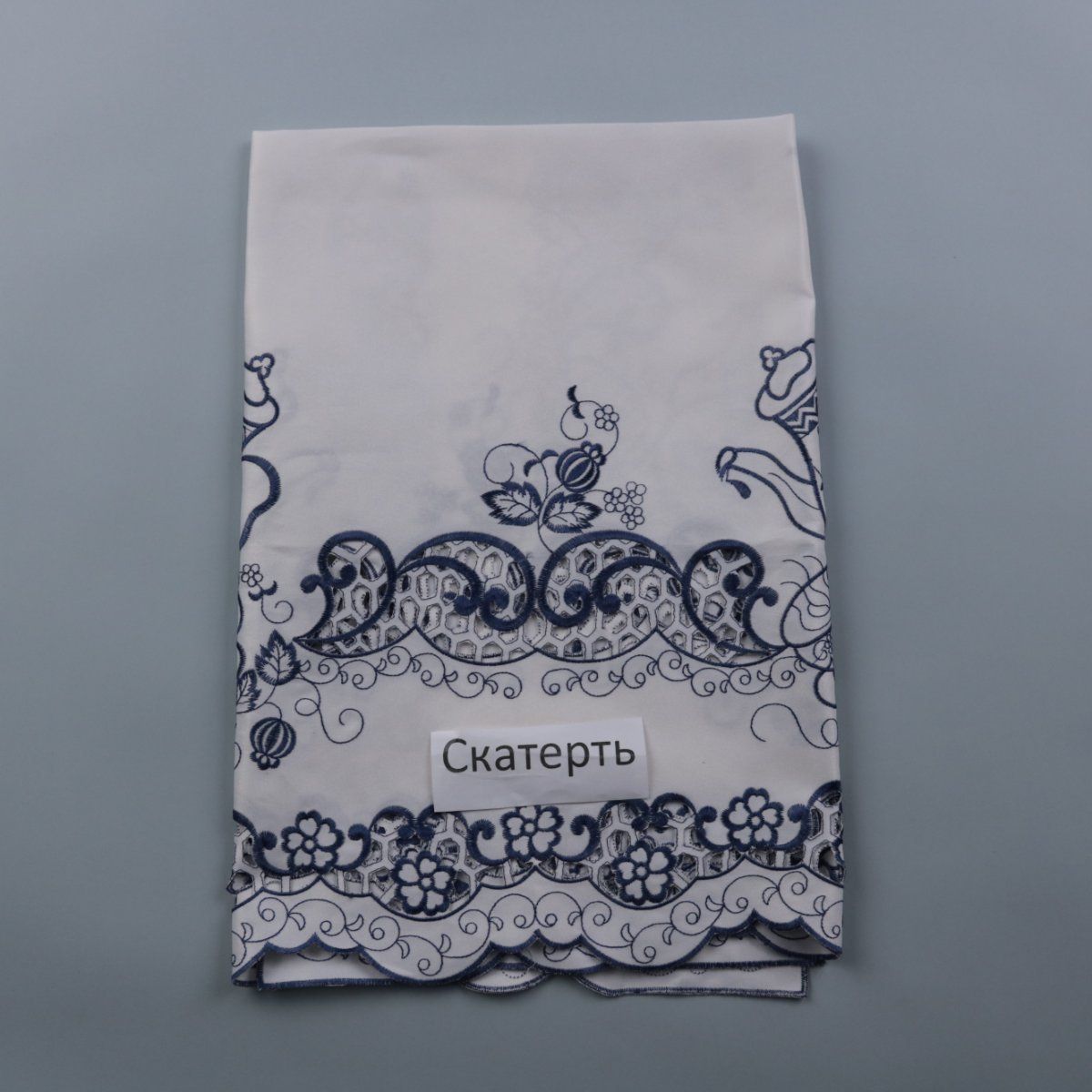 Скатерть белого цвета с синим орнаментом и фигурным краем. Подойдёт для сервировки кухонного или обеденного стола дома и на даче. Легко сочетается с посудой и текстилем и защищает поверхность стола от загрязнений.
