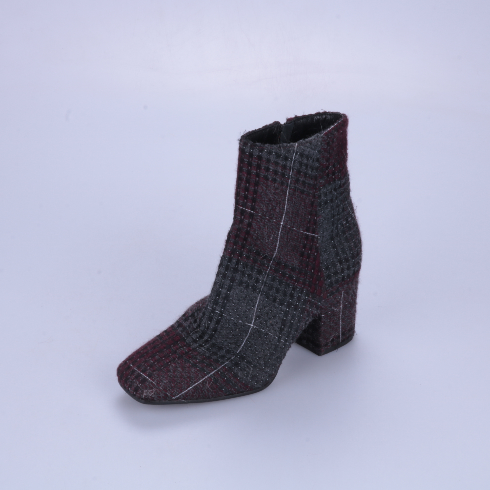 Женские ботильоны из текстиля в клетку в бордово-серо-чёрной гамме, на устойчивом каблуке и с боковой молнией. Подойдут для демисезона и повседневных образов с джинсами или юбками. Удобно быстро надевать за счёт молнии и устойчивой колодки.