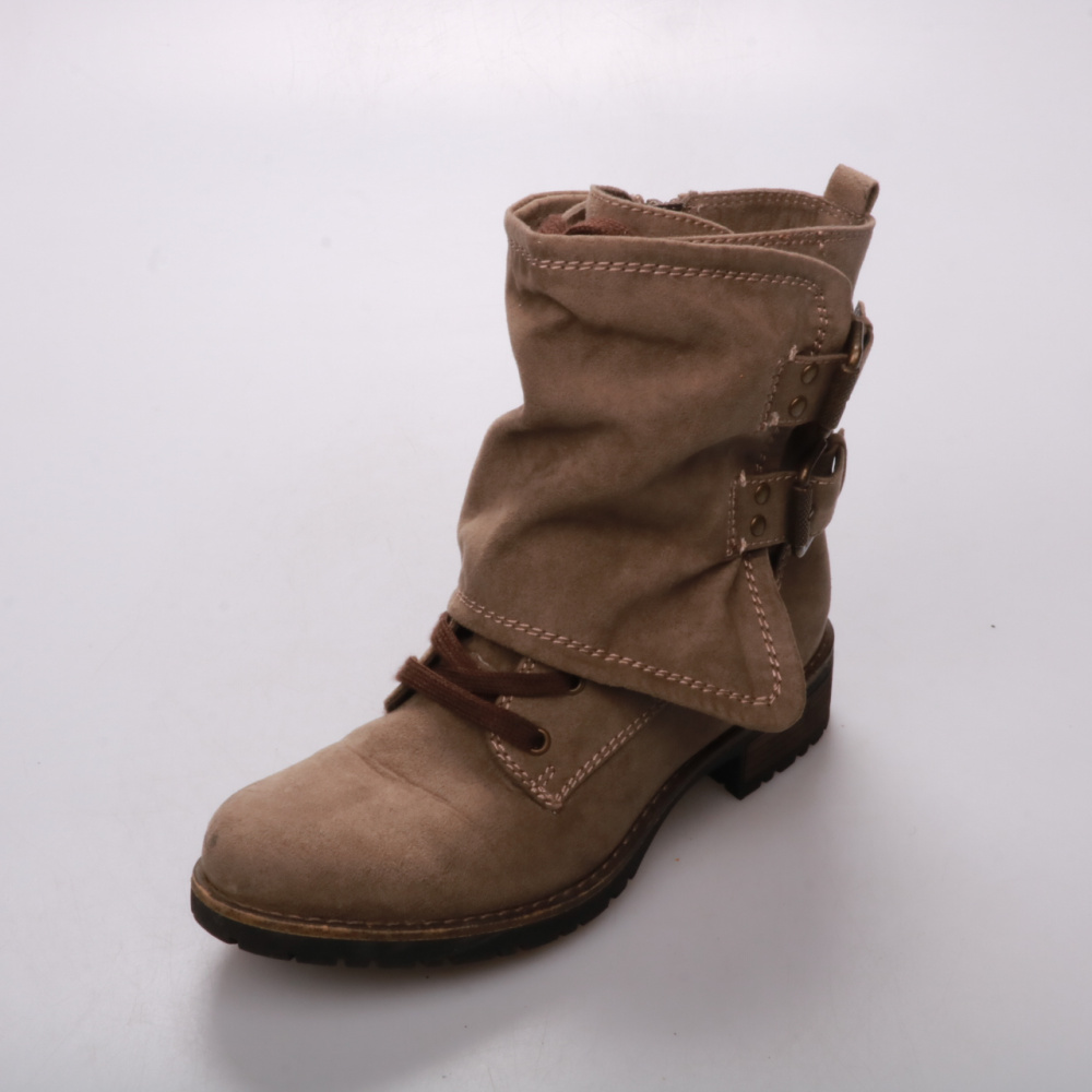 Женские ботильоны из натуральной замши в бежевом цвете, с декоративной шнуровкой и молнией сбоку. Подойдут на каждый день в межсезонье, хорошо сочетаются с джинсами и платьями в стиле casual. Устойчивая подошва с выраженным протектором даёт хорошее сце...