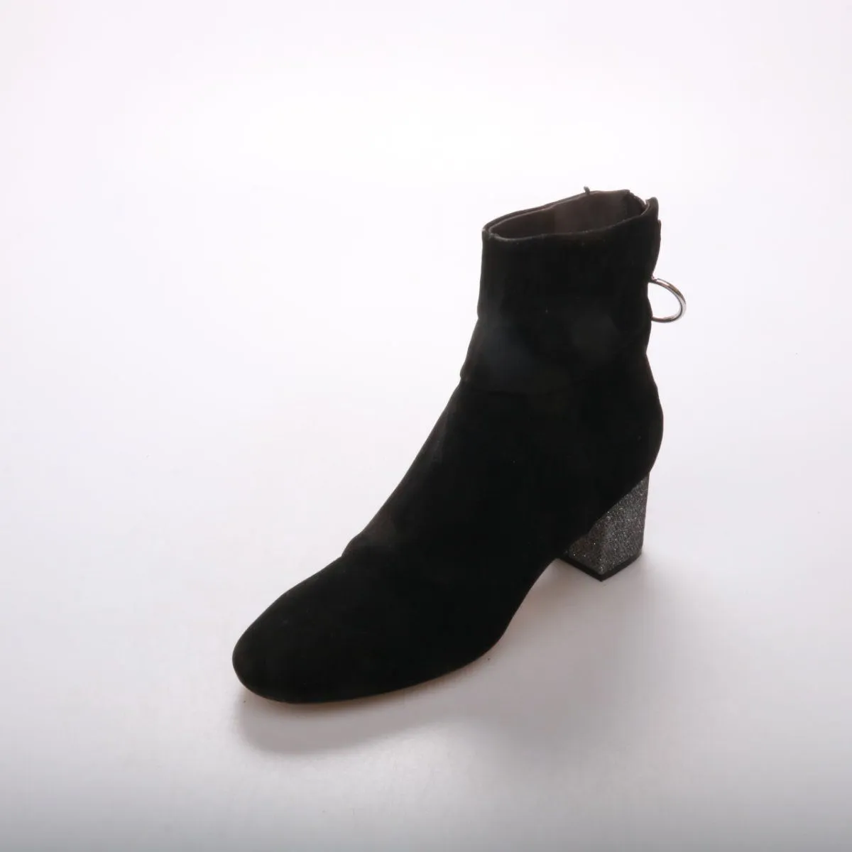 Женские ботильоны из чёрного текстиля/эко-замши с декоративным кольцом сзади и устойчивым каблуком с блёстками. Подойдут для демисезона и городских образов с джинсами или платьем. Удобный широкий каблук даёт хорошую устойчивость при ходьбе.