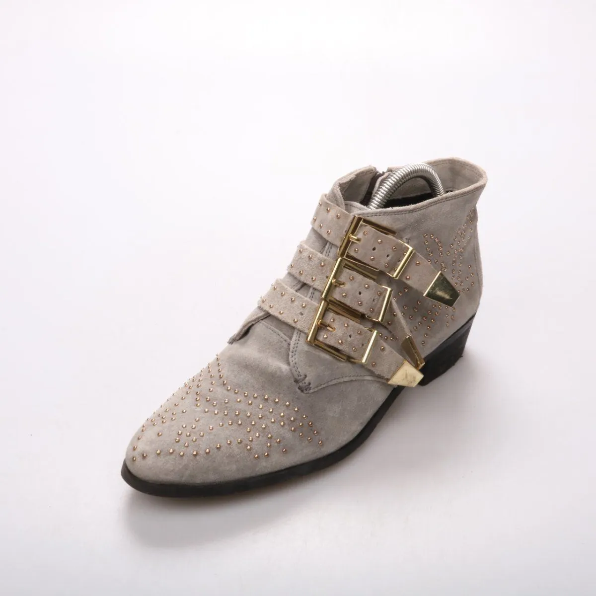 Женские ботильоны Bronx из серой замши с декоративными заклёпками и ремешками с металлическими пряжками. Подойдут для повседневных образов в демисезон с джинсами или платьями. Удобно надевать за счёт боковой молнии и устойчивого невысокого каблука.