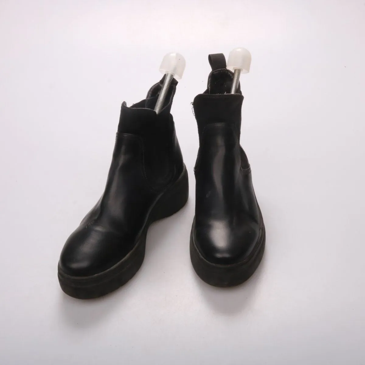 Ботильоны H&M в стиле челси из чёрного гладкого материала на утолщённой подошве. Подойдут для повседневной носки в городе в межсезонье и легко сочетаются с джинсами и платьями. Эластичные вставки по бокам помогают быстро надевать и снимать обувь.