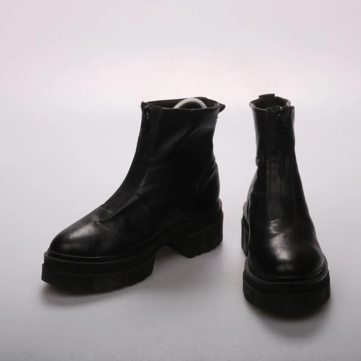 Черные женские ботильоны на устойчивом каблуке с молнией и массивной тракторной подошвой. Подойдут для города в осенне-весенний сезон и на прохладную погоду. Рельефная подошва даёт лучшее сцепление и более уверенную ходьбу.